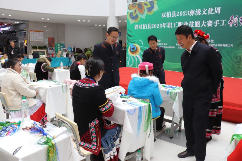 在双柏县2023彝绣文化周活动现场,刘勇了解手工刺绣竞赛情况的同时,还察看了参展绣品,了解彝绣企业带徒传技、技艺传承、带动农民就业增收和生产经营、产品销售等情况,并与企业负责人、部分绣娘深入交流。