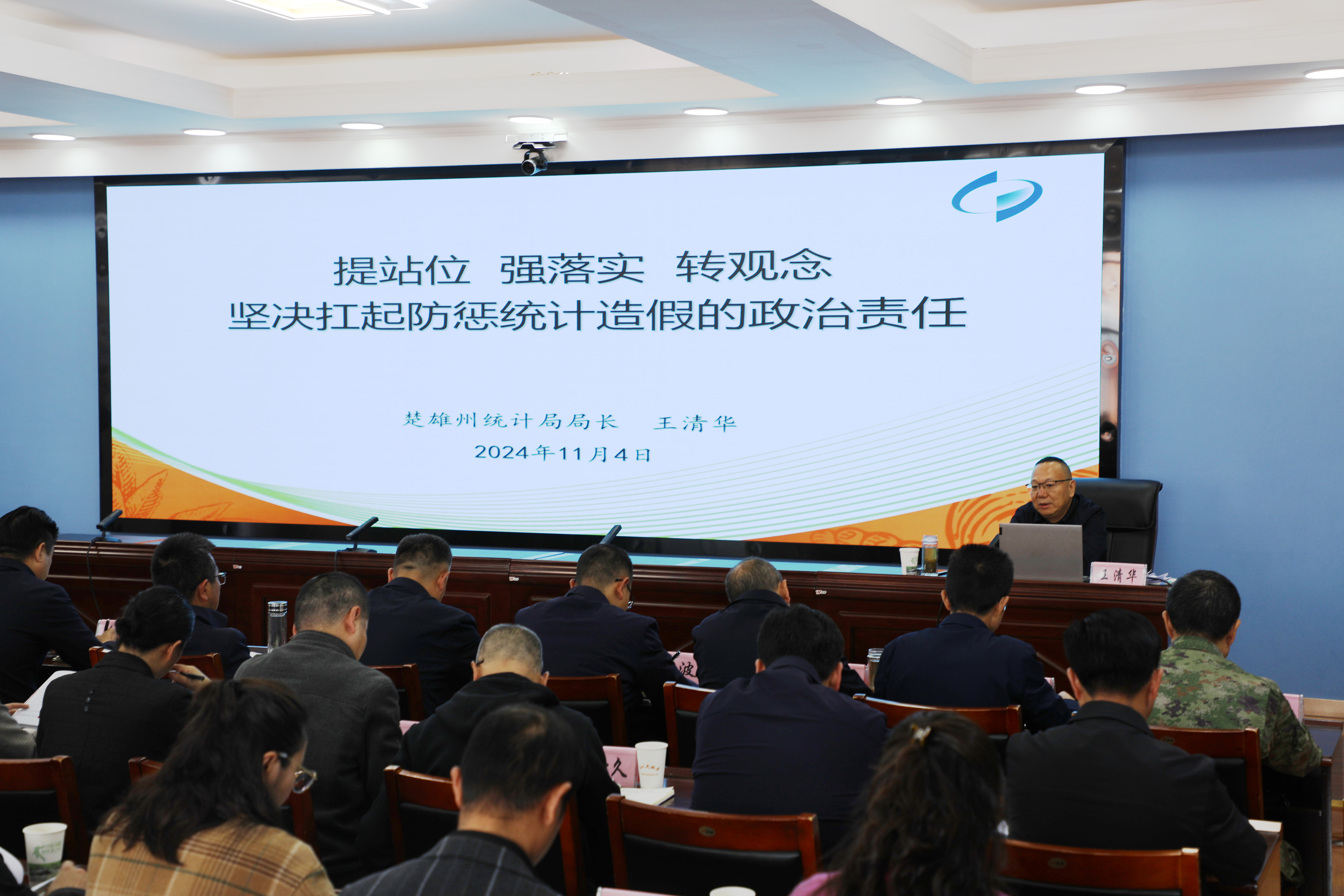 会上,王清华局长以“提站位、强落实、转观念,坚决扛起防惩统计造假的政治责任”为主题,从深刻领会习近平总书记关于防治统计造假的重要指示批示精神,统计造假屡禁难绝的原因分析、统计改革重要文件及内容解读、领导干部统计法律责任统计机关要切实履行好三种责任以及新《中华人民共和国统计法》介绍等六个方面作了专题辅导。他强调,要把学习贯彻习近平总书记关于统计工作的重要讲话重要指示批示精神作为重大政治任务,学习贯彻新修改《中华人民共和国统计法》等相关统计法律法规,树立和践行正确政绩观,切实增强做好新时代统计工作的责任感、使命感、紧迫感。加强统计数据的审核评估,坚决防范和惩治统计造假、弄虚作假,确保统计数据的真实准确。提升服务水平,完善统计工作机制,强化统计队伍建设,推动信息化、大数据等新技术在统计工作中的转化与运用。统计机关要切实履行好三种责任,以习近平法治思想为引领,全面推进依法统计依法治统,为推动统计现代化改革、服务高质量发展提供坚强有力的法治保障。