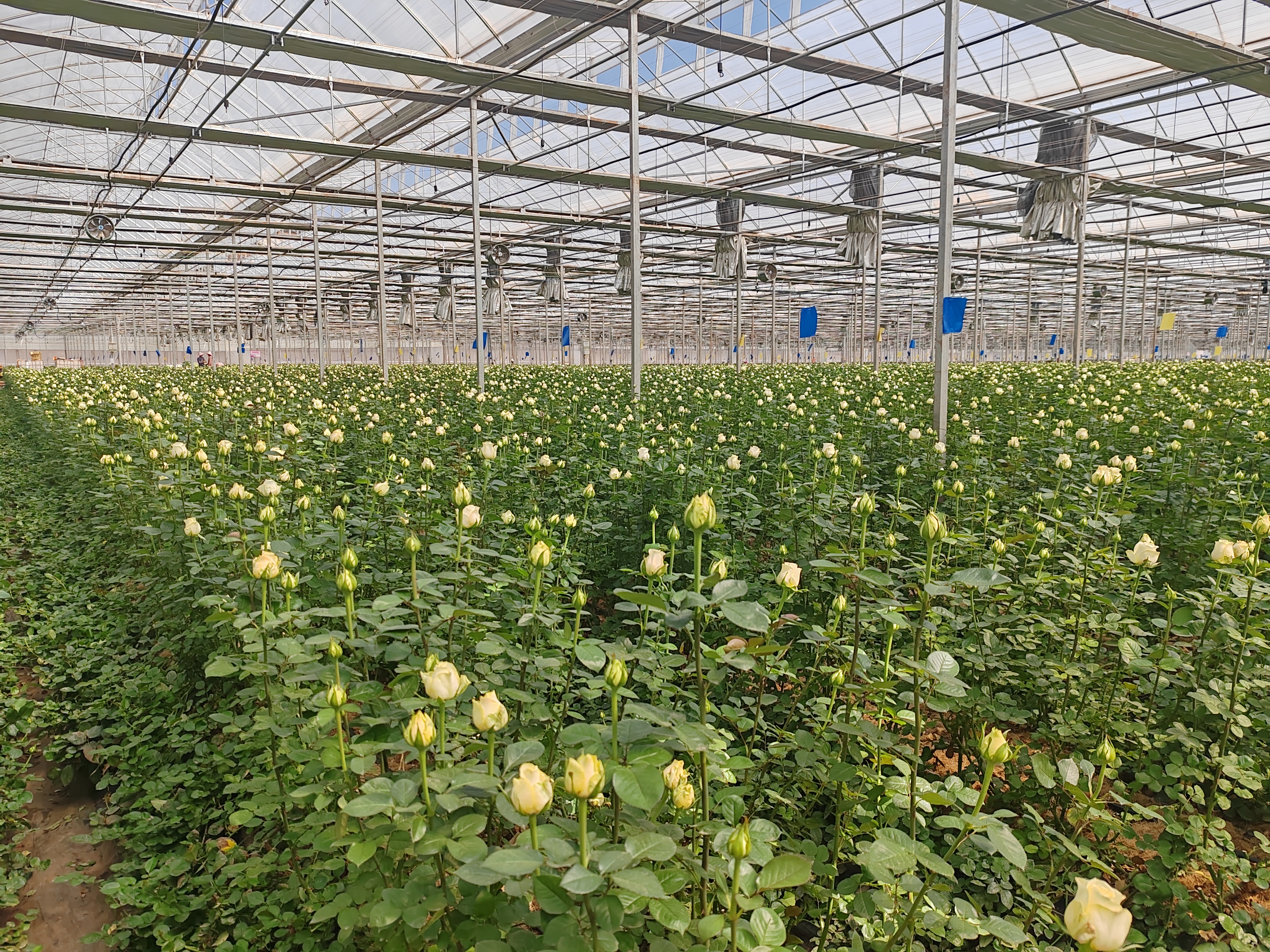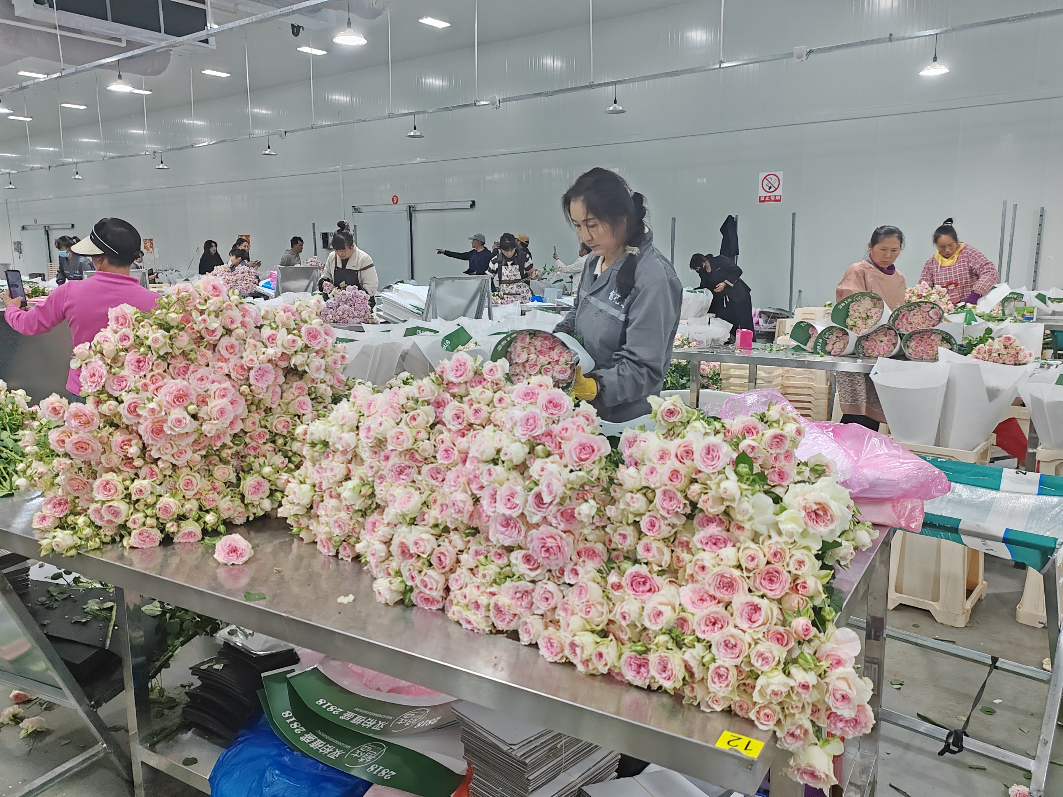 暖阳洒在大庄数字花卉产业园,馥郁芬芳随清风拂过每一位参观者的面庞。跟随讲解员的脚步,现代化车间里呈现出生机勃勃的景象:女工们灵巧的双手正在分拣刚采收的鲜花,修枝、切割、包装的工序行云流水,沾着晨露的花束经过标准化处理后,即将带着芬芳走向花卉市场。移步至玫瑰花田,数千株“爱莎”“奶油杯”等品种的玫瑰正舒展着娇艳欲滴的花瓣,编织成绵延的彩色锦缎。