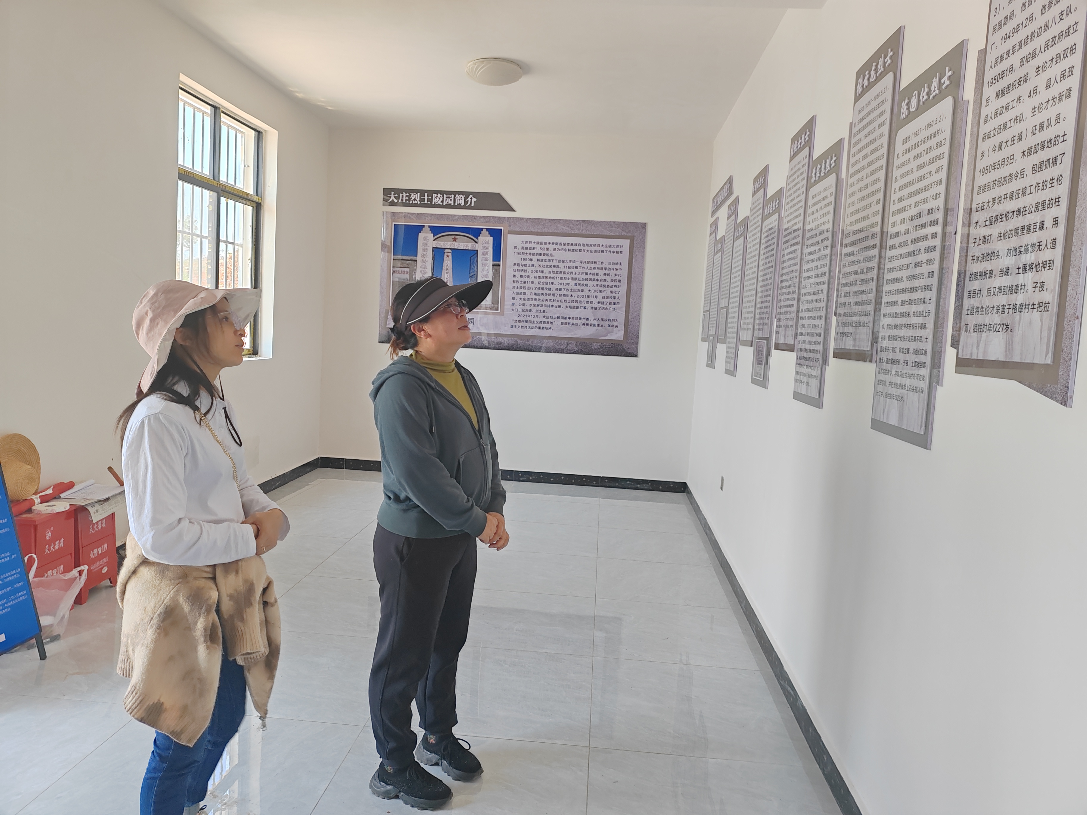 讲解员动情的叙述中让我们仿佛看见穿透时空的群像:本地烈士苏家惠是大庄镇黑普村人,1950年5月4日,暴动土匪按匪首捉拿征粮干部的指令,将在大黑泥村征粮的苏家惠同志抓捕后,拉到村外河边,用石块你一块我一块地把他打倒在地,再用刀砍杀至死。……回顾这段历史,这伟大的胜利是来之不易的,在这块土地上来自全国各地的28位优秀儿女英勇献出了年轻的生命。他们在凶残的土匪面前,大义凛然,宁死不屈,把鲜血洒在了异乡的土地上,烈士们走了,但他们的英名与世长存!他们的光芒与日月争辉!