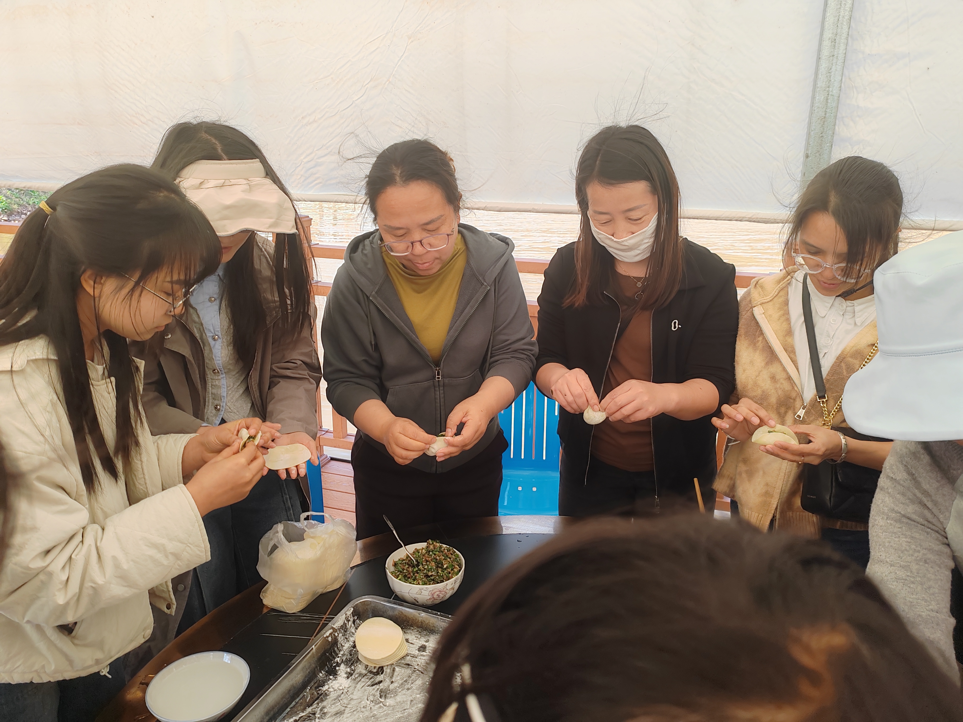 青翠的韭菜末、白菜末和晶莹的猪肉馅整齐地放在餐桌上。女职工们围坐在桌子周围。“小时候妈妈总说‘饺子要包得像金元宝’,今天可得好好学一学!”财务室的小普一边笑着摊开饺皮,一边把馅儿放入饺皮。经验丰富的鲁大姐正手把手教新人捏褶:“左手虎口卡住剂子,右手食指轻轻推褶……你看,这样封口才紧实!”90后司机小王笨拙地捏出歪扭的“元宝饺”时,整个餐桌笑成一团,沾满面粉的手掌在空中击出欢乐的节拍。