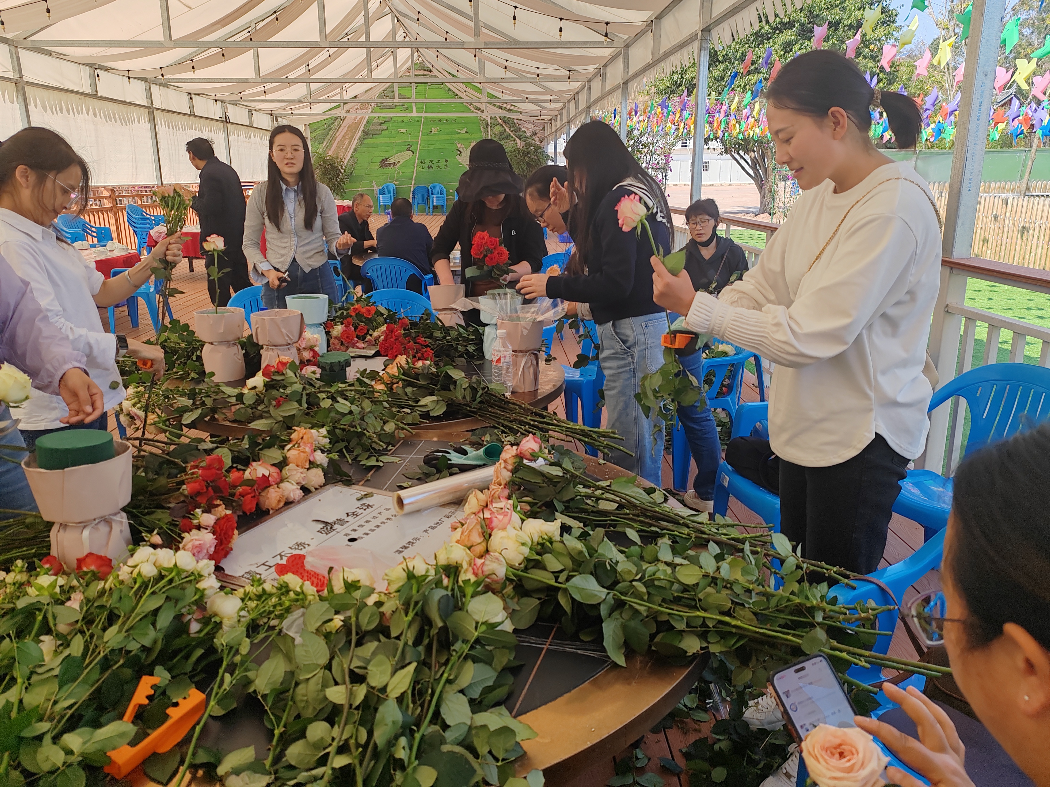 阳光为每一片花瓣镀上金边,15位女性指尖轻抚着娇艳的花朵,剪刀起落间花枝在捧花桶中舒展成诗。活动现场翻飞的除了各色玫瑰,更有此起彼伏的快门声——瑶姐说她要将今天插好的花送给她的妈妈,这时镜头定格在她睫毛上沾着的星点花粉上,晕染出温馨的色彩。这些承载着巧思的花艺作品装点了三月午后的时光,也见证了现代女性在传统美学中生长的精神原野。