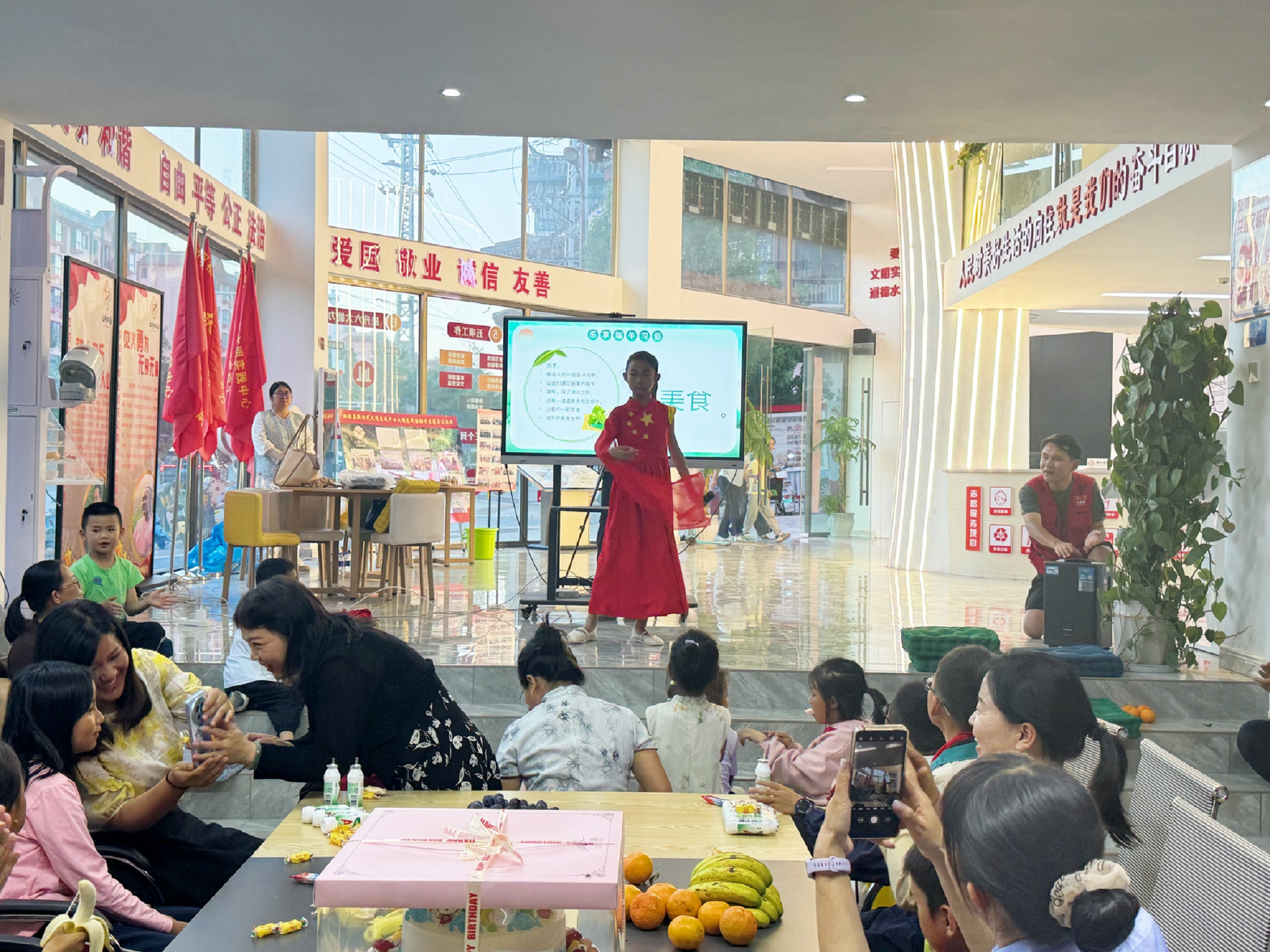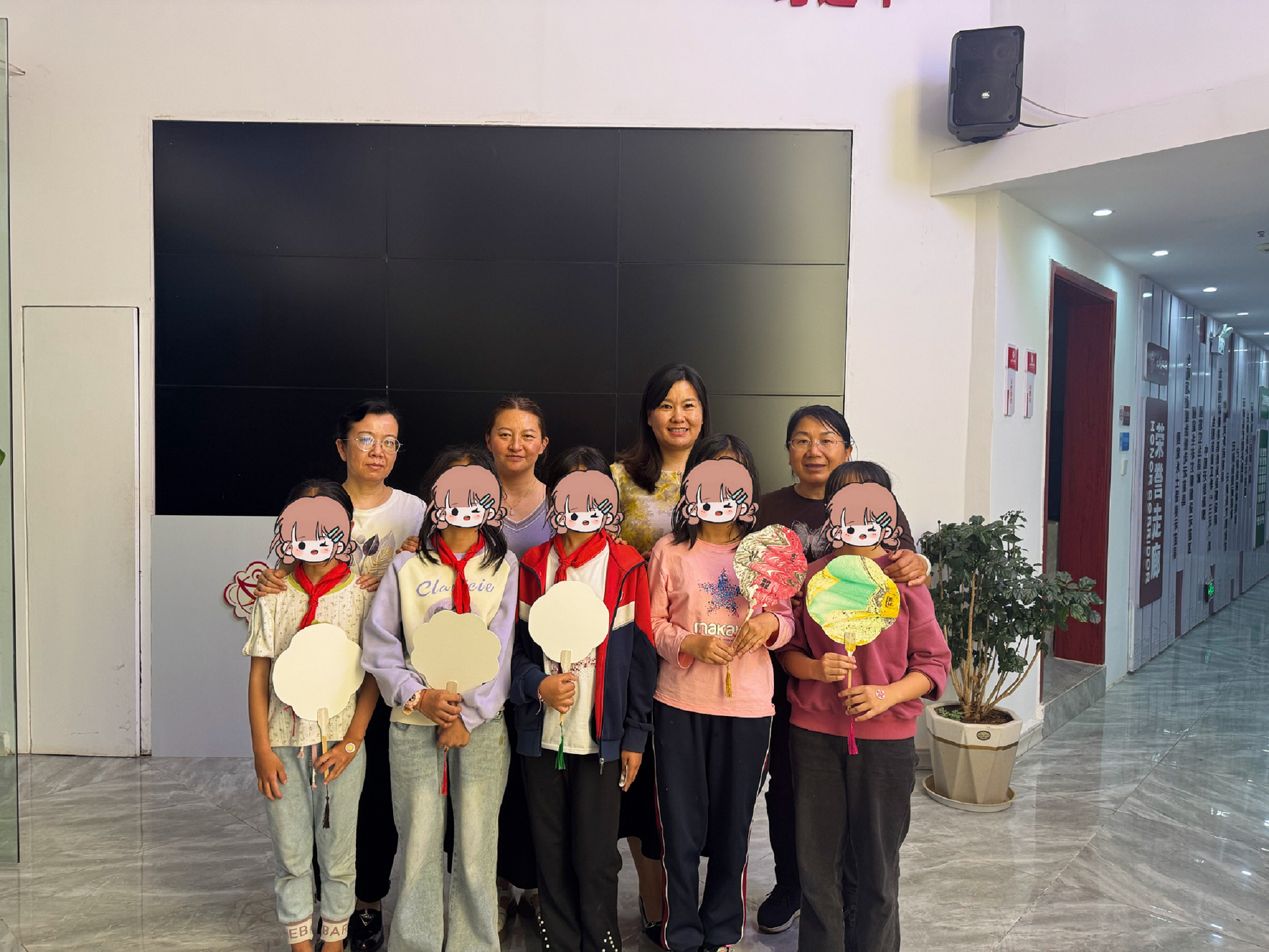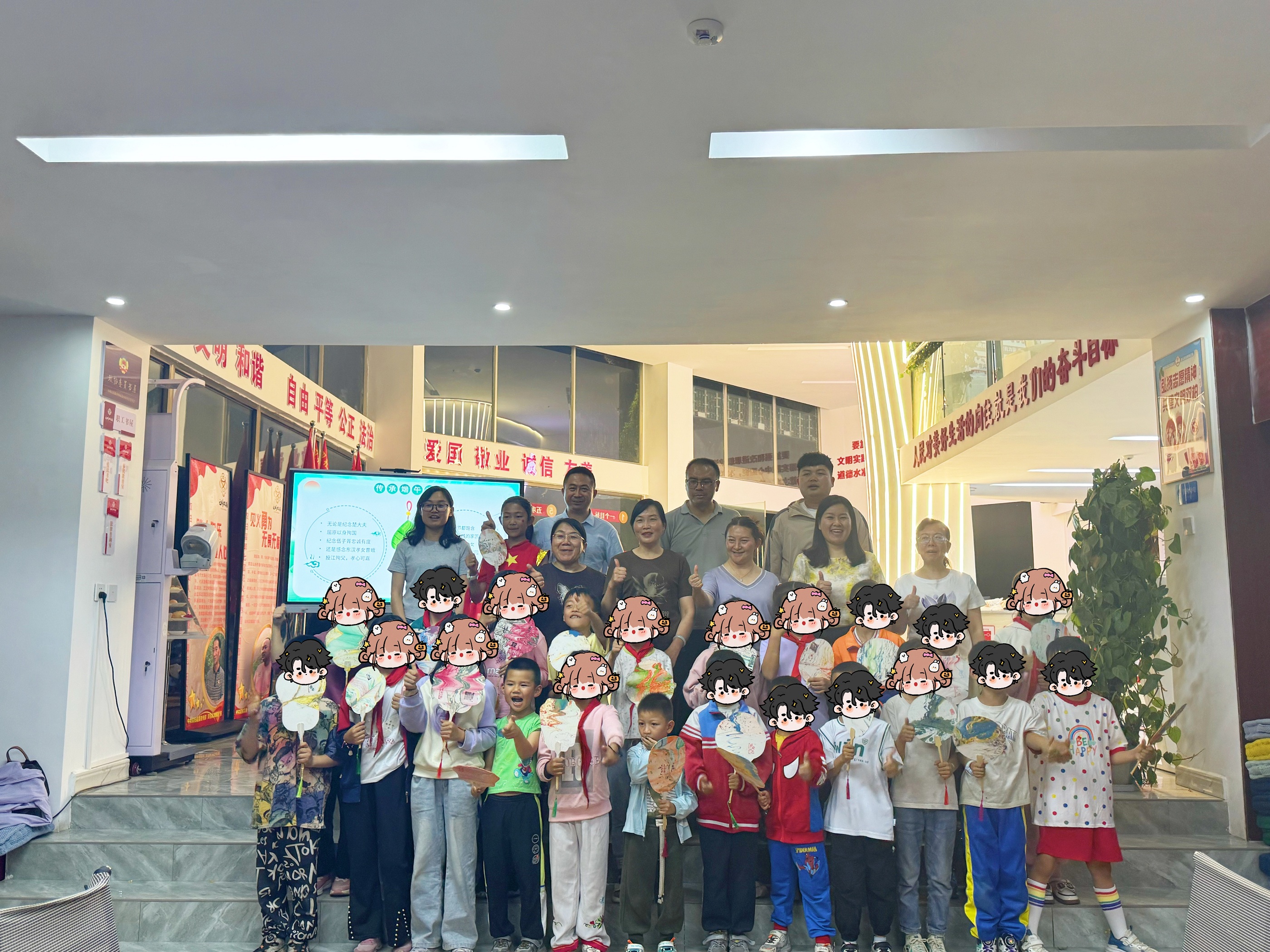随后,爱心妈妈和小朋友们开始了“破冰之旅”。孩子们如欢快的小鹿冲向舞台,争先恐后地举手报名,眼神里满是期待与自信。转眼间,灵动的身影跃上舞台,清脆歌声如银铃摇响,欢快舞步似蝶翼翩跹,童真的热情瞬间点燃全场。接着,老师为大家讲解漆画扇子“以漆为墨,以扇为纸”的艺术渊源,孩子们托腮聆听,不时发出惊叹。制作环节,爱心妈妈们化身“艺术导师”,与孩子一起调配漆色、绘制纹样。
