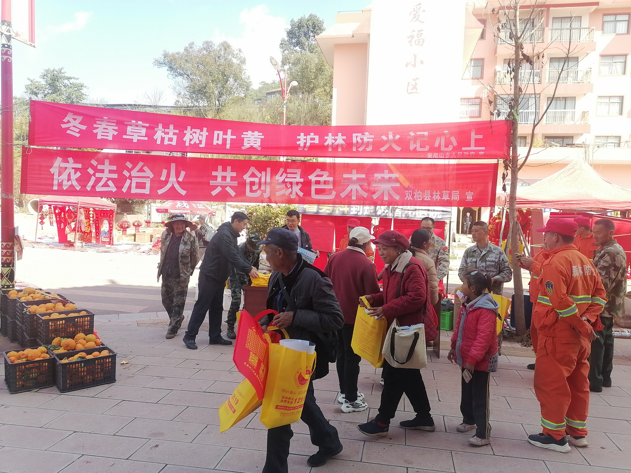 集中宣传,强化宣传效果。联动双柏县林业和草原局充分利用年关街天人流集中场所,采用“宣讲+宣传”的形式,通过现场讲解、发放宣传单、悬挂横幅等方式,面对面向群众普及森林草原防火的重要性,与群众讲解森林火灾的危害、严禁野外用火等森林防火知识,提醒群众在防火期严禁私自焚烧甘蔗地等其他农事用火,确实需要焚烧的必须要按流程审批《野外用火许可证》才能进行焚烧。此次宣传活动共计发放《云南省森林防火条例》300余份,森林防火宣传环保袋300余个,森林防火纸杯1000余个,为群众答疑20余次,切实提高了广大人民群众的森林草原防火意识。