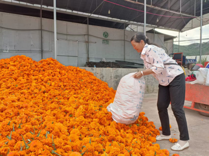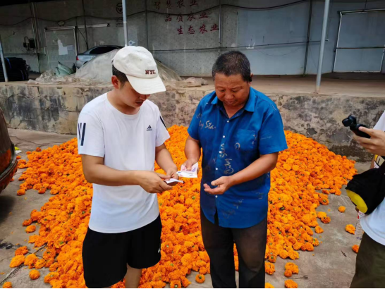 收购现场,人头攒动、热闹非凡,一筐筐新鲜采摘的万寿菊堆积如小山,工人们忙着过秤、登记、装车,脸上洋溢着丰收的喜悦。“之前我一直种植玉米和烤烟,今年是我种了15亩万寿菊,原本还担心销路问题,现在政府帮我们联系好公司统一收购,价格稳定,收入有保障,心里踏实多了。今天是第一天收购,我采摘600公斤万寿菊,卖了660元,拿着现钱心里别提多开心。”前来售卖万寿菊的杨大叔笑着说道。