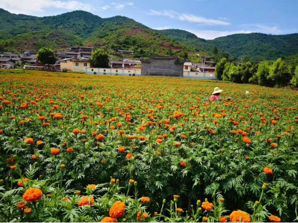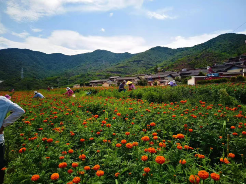 今年,在县委、县政府的坚强领导下,大庄镇立足气候与土壤条件,锚定特色产业增收目标,充分发挥党建引领示范作用,积极探索“村党组织+公司+基地+农户“的发展模式,坚持统一规划、购种、指导、管理、收购,将万寿菊种植作为调整产业结构、促进群众增收、发展乡村旅居的重要产业来抓,在全镇13个村(社区)推广种植万寿菊2275.5亩,带动628户农户参与,最大连片种植区超过200亩。