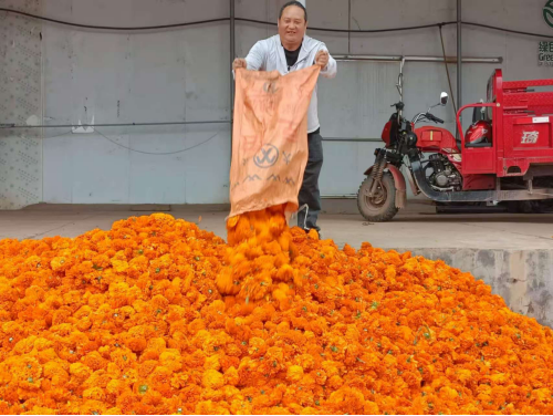 眼下,万寿菊首轮采摘工作已在各村(社区)同步展开。据悉,本轮收购将持续3天左右。下一步,大庄镇将持续发挥党建引领的作用,做好集管护、采收、运输、销售等全链条服务,为群众增收致富做好保障,让这朵“致富花”真正结出“幸福果”。