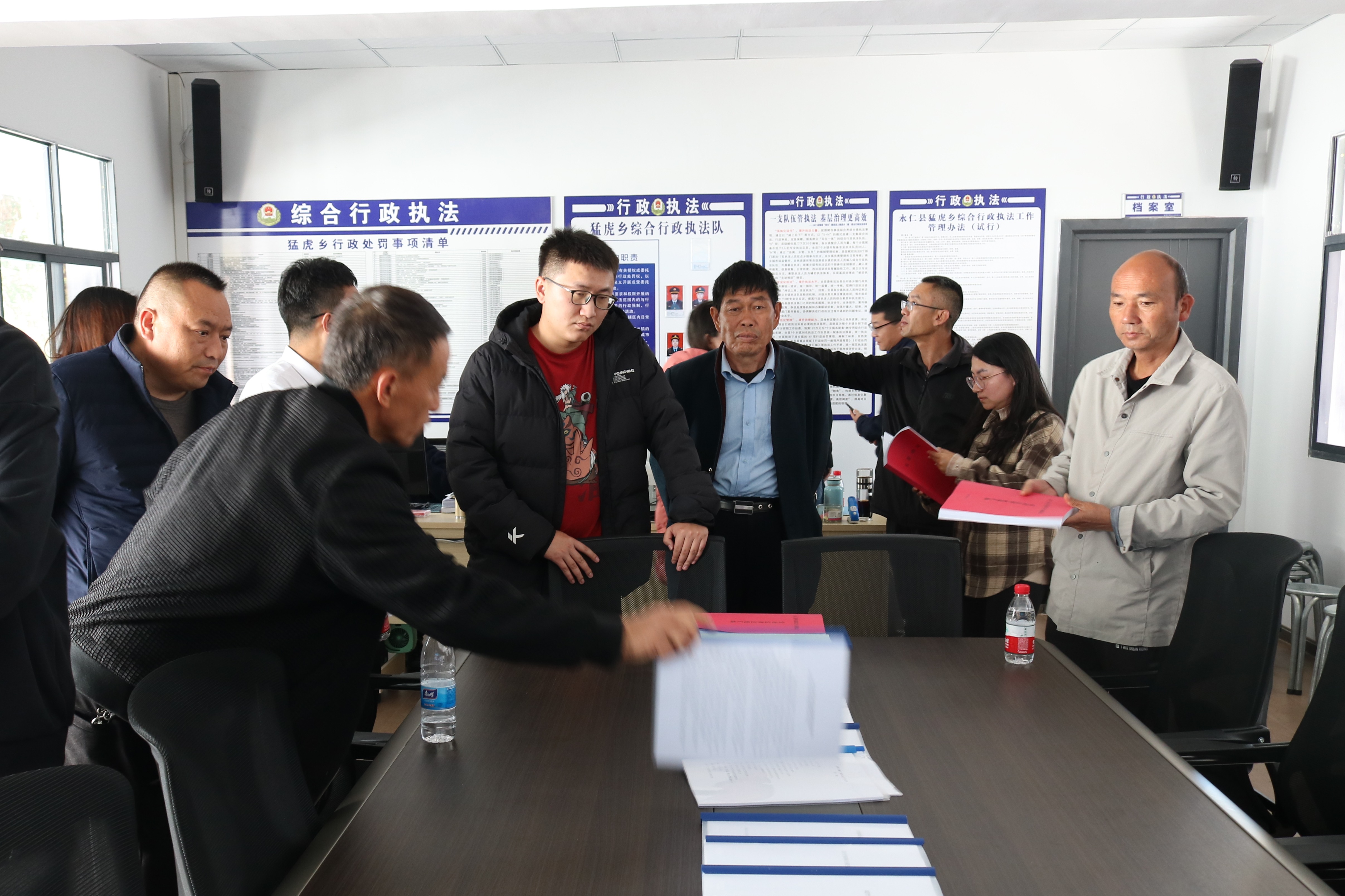 在猛虎乡,考察团边观摩边听相关负责人介绍综合行政执法队建设情况和行政审批服务推进情况,观看了综合行政执法专题片。
