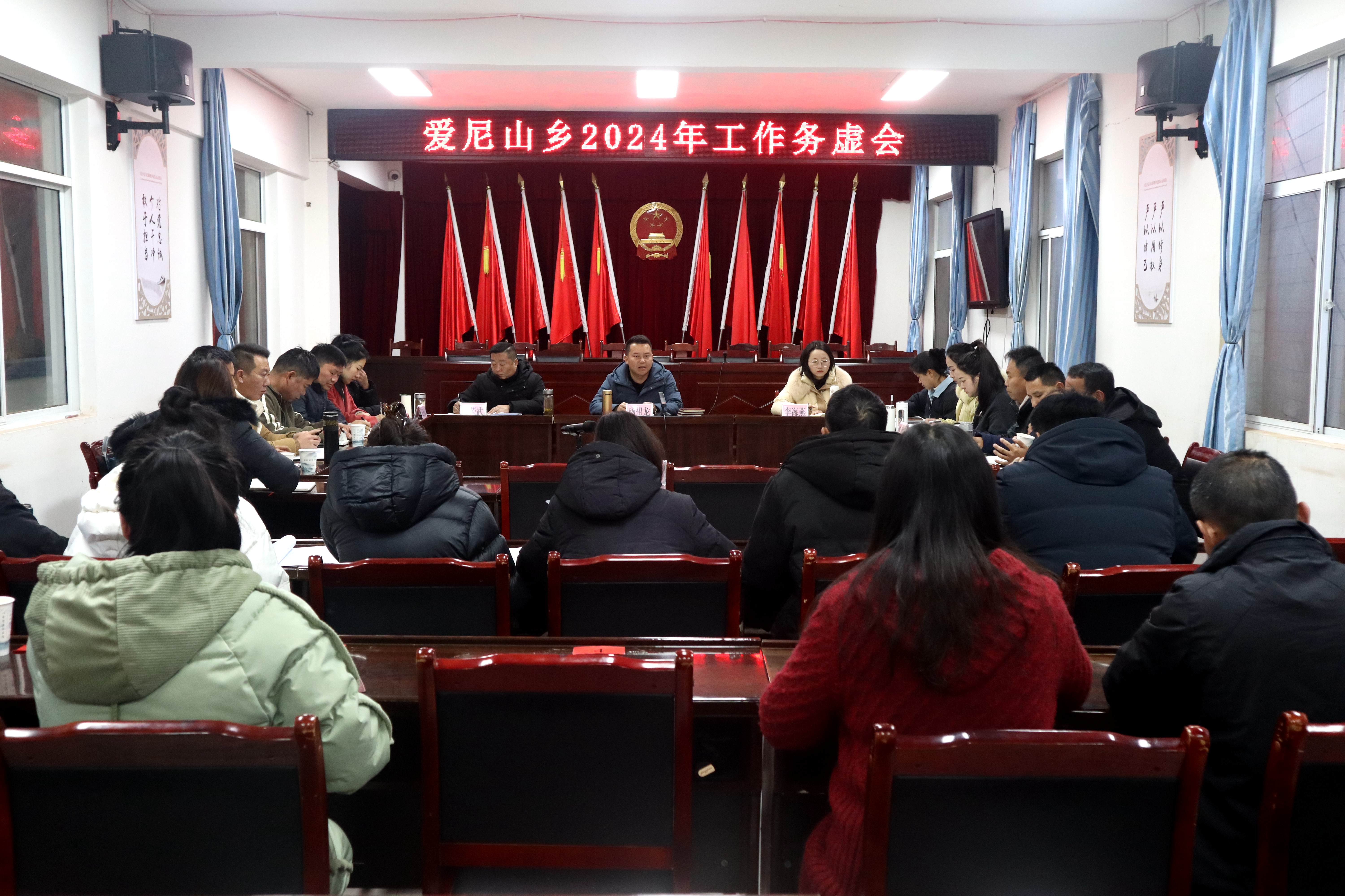 1月26日上午,爱尼山乡在乡人民政府大会议室召开2024年工作务虚会,乡党政班子成员,各站所负责人、各村(社区)党总支书记共40余人参加会议。