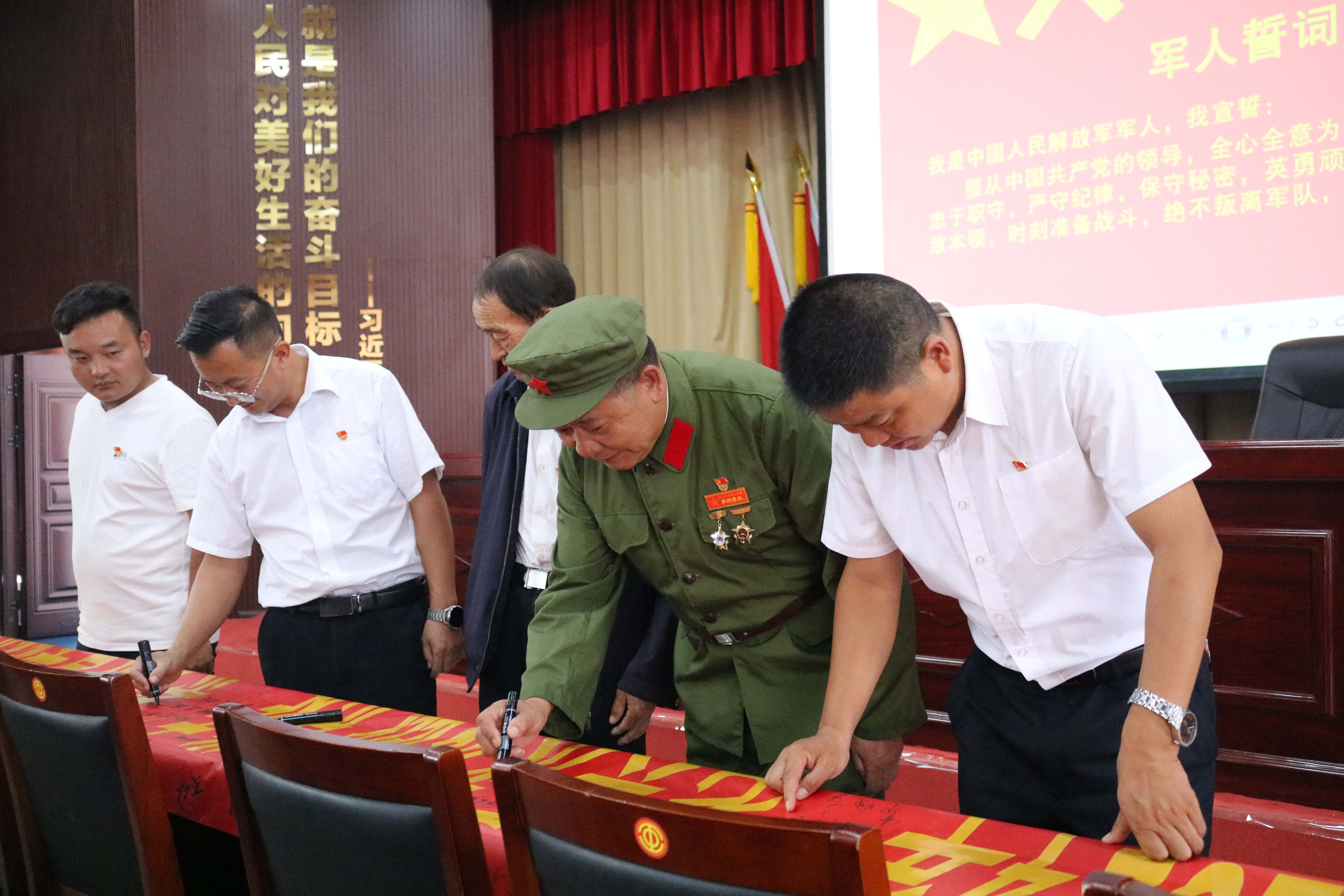 面对军人誓词,退役军人们的宣誓字字铿锵,振奋人心,庄严地在活动布标上签署了自己的名字。退役军人代表们纷纷表示,将继续扎根基层、服务基层、服务群众,坚定退伍不褪色的信仰,永葆军人本色,永远跟党走,为广大人民群众做好事、做实事,在乡村振兴的道路上继续发挥退役军人力量、展现退役军人风采,为全镇发展贡献力量。