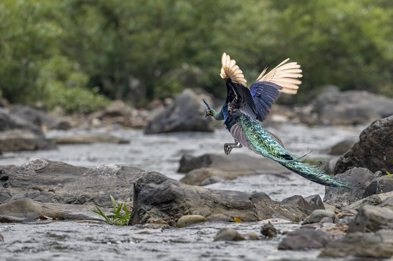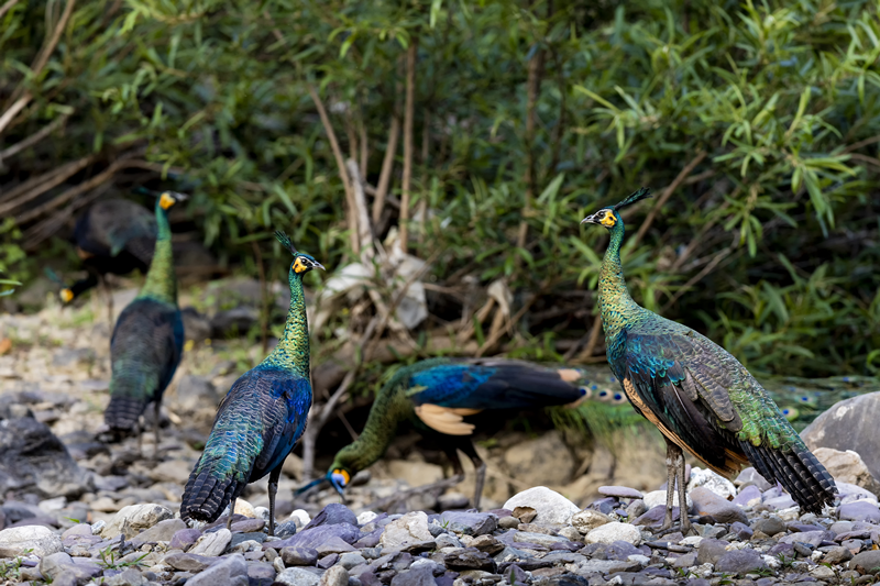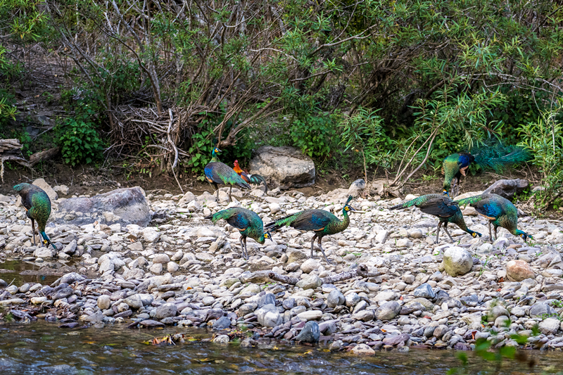 这里有“百鸟之王”绿孔雀。据《乾隆(石咢)嘉志》记载:“普脚山,在县南五十里,出孔雀。”普脚山即现在的(石咢)嘉镇义隆村委会普脚村一带。现(石咢)嘉境内绿孔雀种群数量达56群362只,故其又被称为绿孔雀小镇。当地人至今还称其为凤凰、大鸟、神鸟,亦有人称呼它的土名“豌豆鸡”。在恐龙河自然保护区石羊江、恐龙河、小江河畔绿孔雀分布区域,与高山不同,这些地方地势平坦、热量充足、土地肥沃、季节变化明显,河流从盆地中间蜿蜒流过,对于绿孔雀,这是名副其实的风水宝地,它们可以在河边的沙滩上求偶、觅食,在河岸边的大树上睡觉、在草木茂盛的地方筑巢。