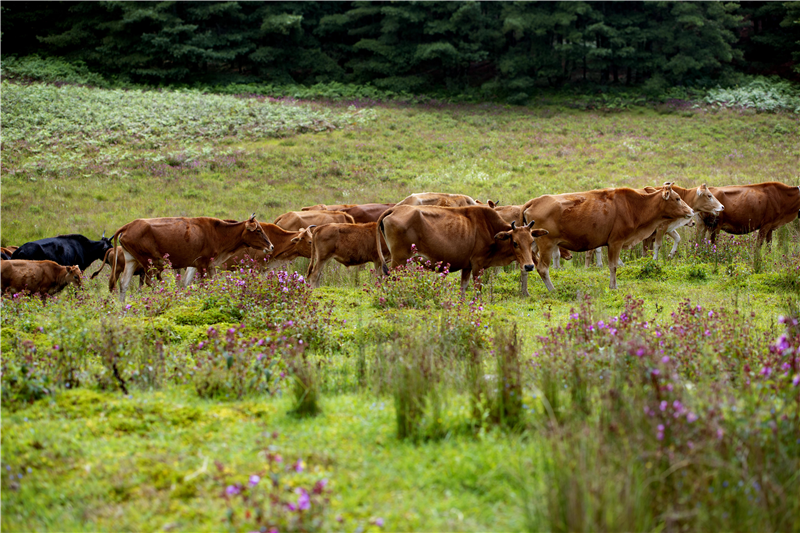 若驱车一路向上行进,半个小时左右,行至距离(石咢)嘉集镇30公里的地方,视野瞬间开阔,一望无际的松林绿草,山花遍野,这里便是(石咢)嘉大名鼎鼎的“网红”景区——九天湿地。它位于哀牢山腹自然保护区边缘,平均海拔2400米,面积约二万多亩,是云南省中部最大的高山湿地,由大马房湿地、老王坪湿地、小河坝湿地三大片组成,有着“哀牢山明珠”的美誉。湿地周围山林茂密,是观光的天然伊甸园,是游客遛马、听林涛声的理想之所。丰富的湿地资源孕育了万亩高山草甸,广阔的草甸像海湾一样镶嵌在苍茫的群山之间,芳草碧连天,牛羊悠闲啃草的声音和阵阵牧笛萦绕耳畔,置身其中让人身心豁然开朗,仿佛身处绿野茫茫的大草原一般。