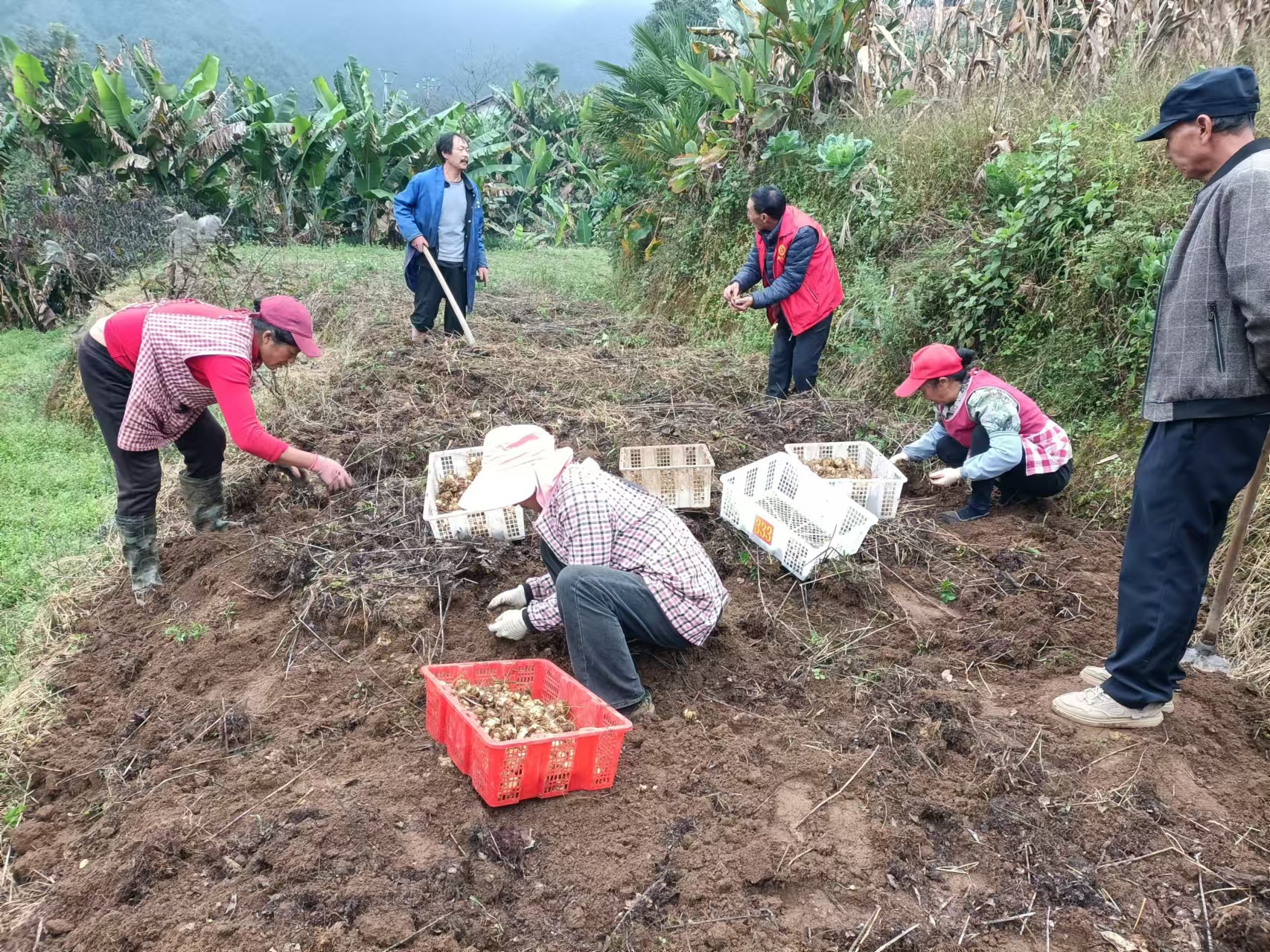 走进(石咢)嘉镇新厂村委会百合种植基地,整个基地呈现出一派丰收的繁忙景象。近30名村民热火朝天地忙碌着,他们熟练地将成熟的百合从土中挖出,去根、剥泥,再装筐、搬运、装车,一颗颗“致富果”和村民们奋力采收百合的身影,形成了一幅增收致富的动人图景。