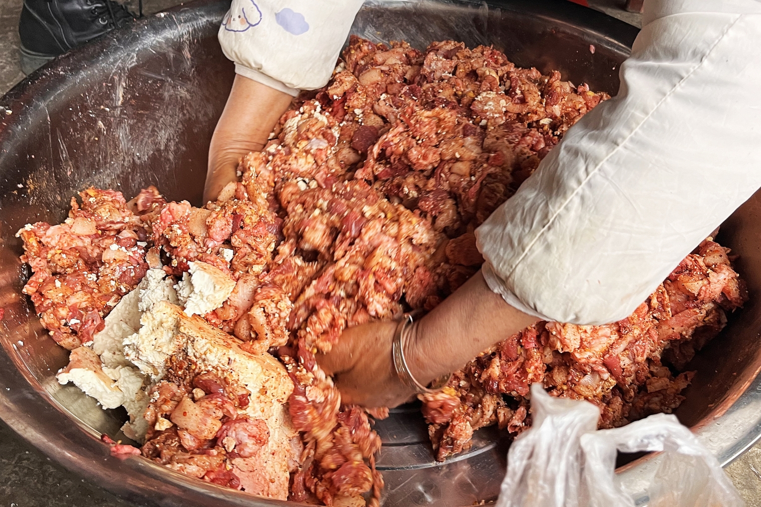 家住双柏县独田乡大水田村会石头塘村的刘大娘一早就开始忙碌起来,她装的香肠馅料紧实、味道鲜美,是远近闻名的巧手。“以前没有冰箱,也没有什么真空包装,祖祖辈辈的人都会在杀了年猪之后,帮一部分猪肉装进猪的肠子里面,做成香肠保存起来。有些保存好的,可以吃大半年呢。”刘大娘笑呵呵地说。