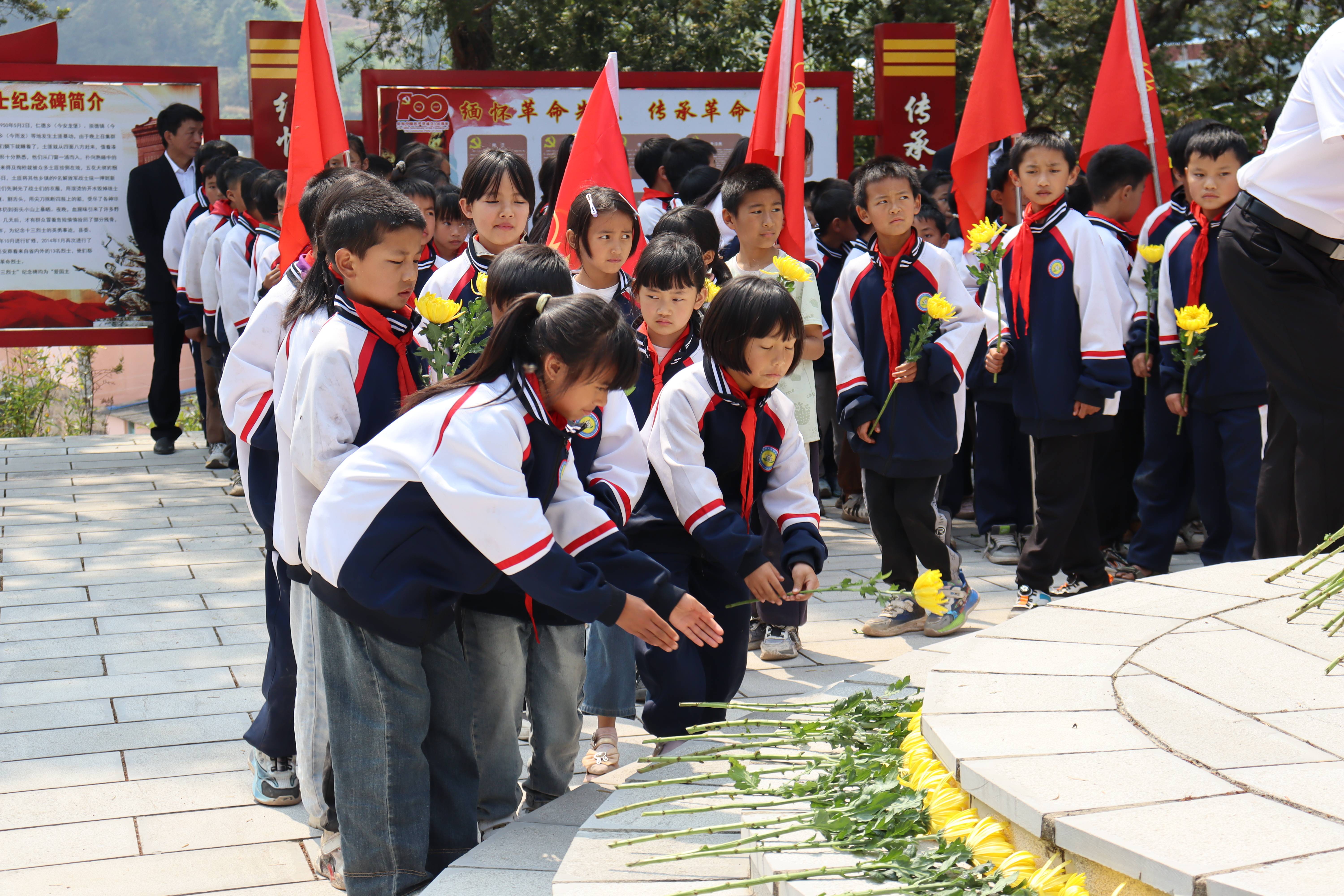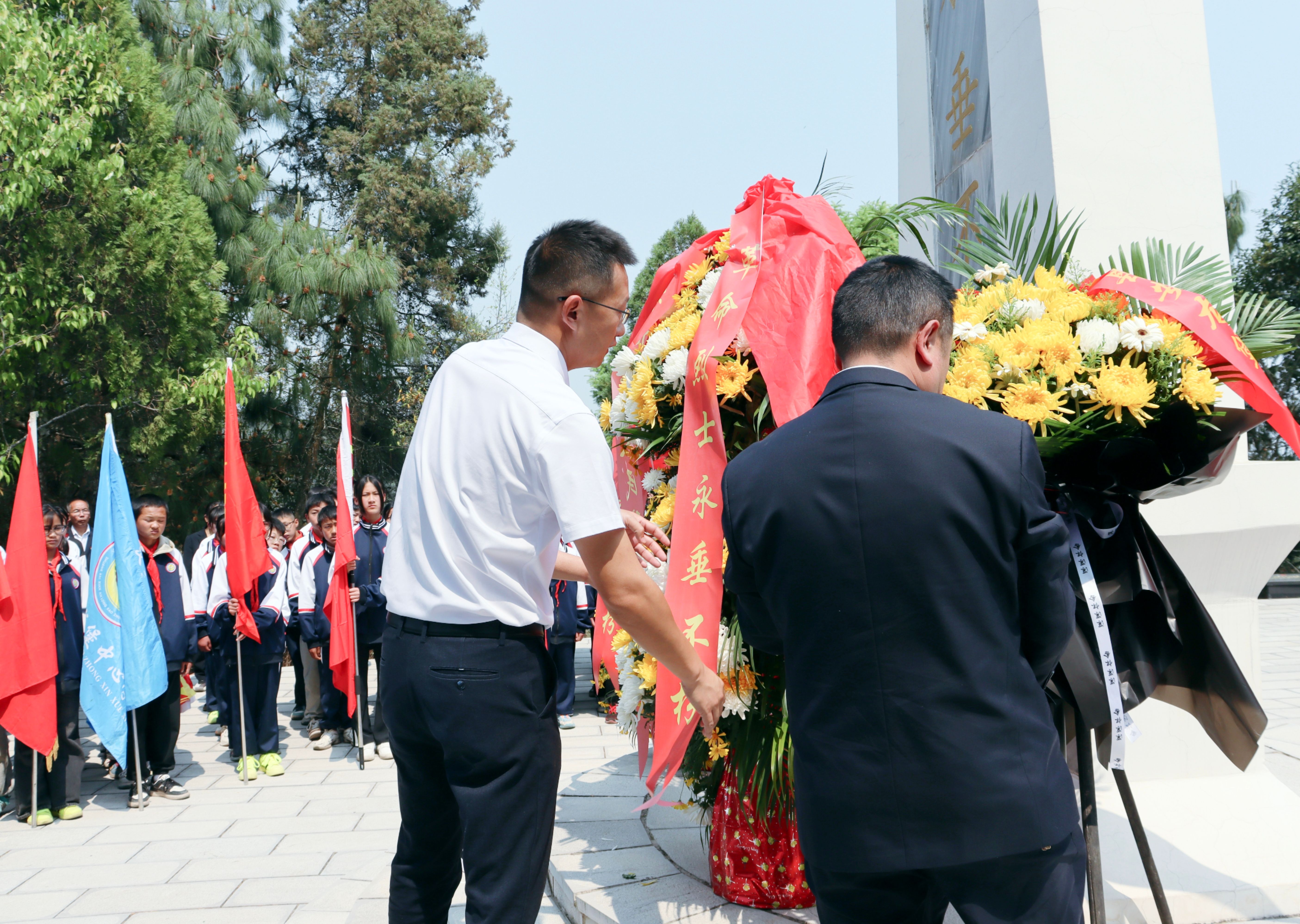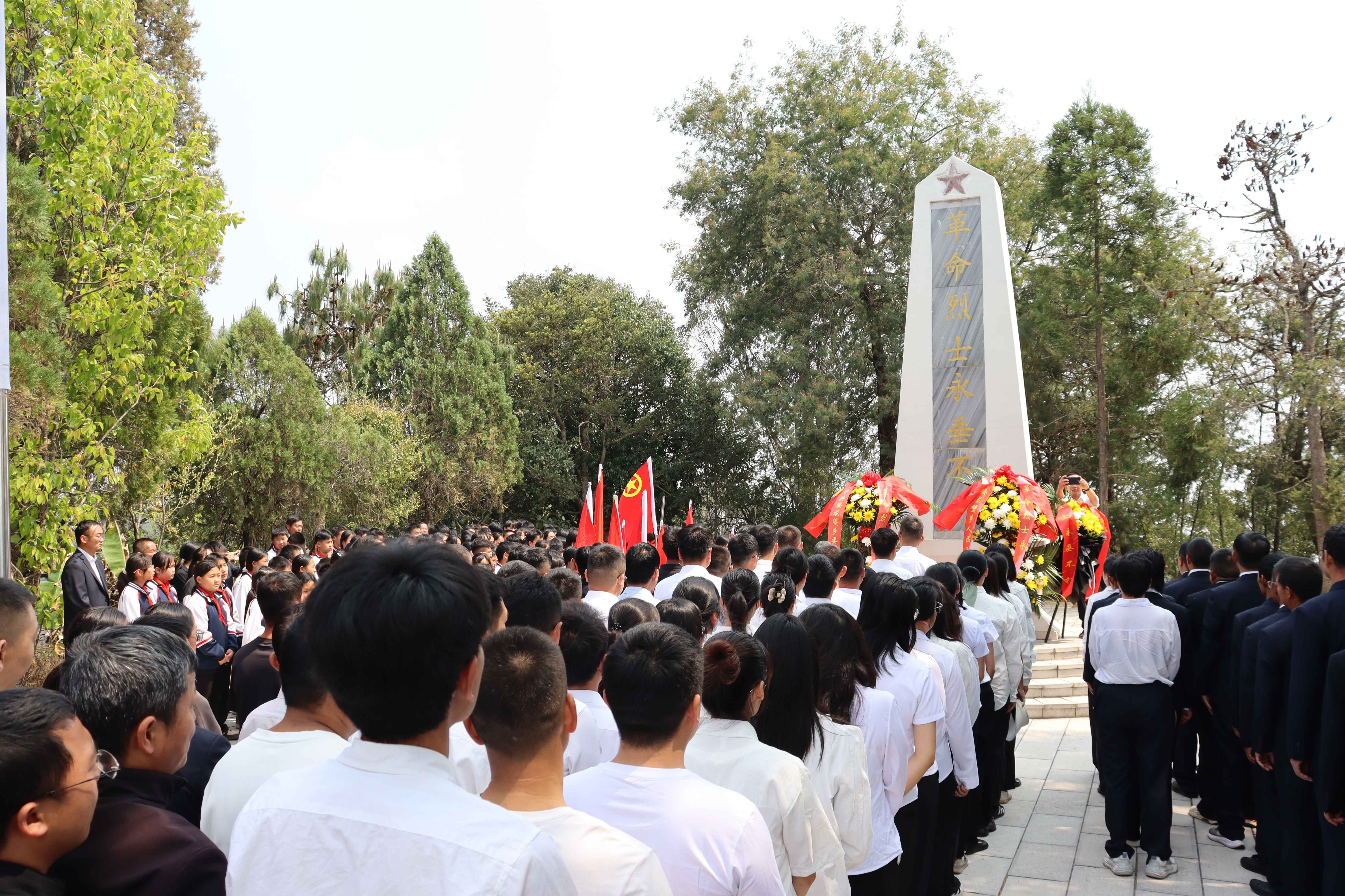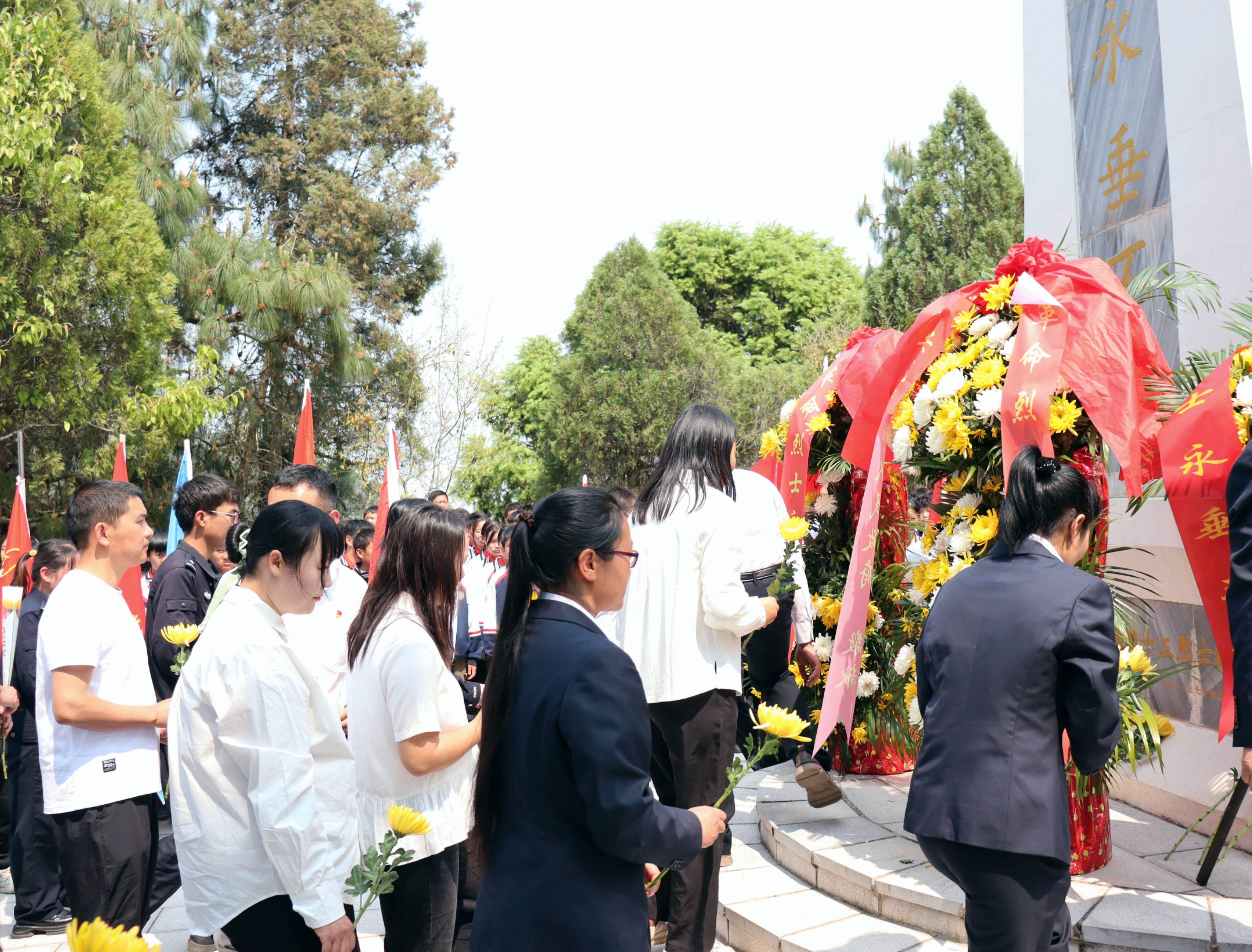苍松翠柏掩映下的新街烈士陵园庄严肃穆,烈士纪念碑巍然矗立。活动开始,雄壮的国歌声在陵园上空回荡,仿佛穿越时空与先烈对话。全体人员面向烈士纪念碑庄严肃立、默哀、行鞠躬礼,以无声的敬意缅怀先烈。紧接着,向烈士敬献花篮,花篮缎带上“烈士精神永垂不朽”的金色字样在阳光下熠熠生辉,全体人员依次将一枝枝素菊轻置于石阶之上,瞻仰革命烈士纪念碑,表达对革命先烈的深切哀思与崇高敬意。