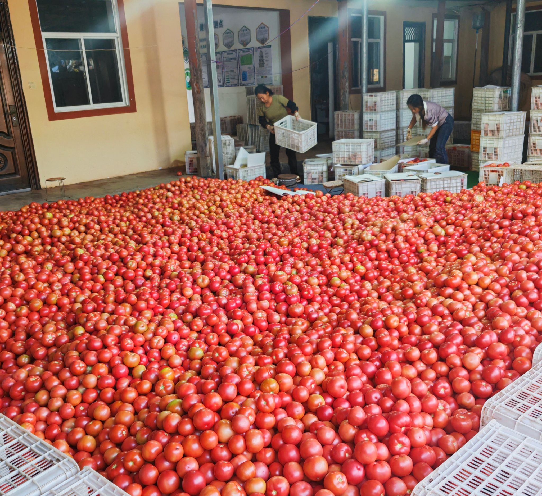 随着西红柿进入丰收期,各地客商纷纷前来洽谈收购。在法念村西红柿集中收购点,种植户满载番茄的三轮车、小货车络绎不绝,将一筐筐刚从地里运来的新鲜番茄卸货、交售;分装区内,工人们按个头大小、色泽快速分级装箱,一箱箱分拣好的西红柿整齐码放,静待装车运往全国多地。