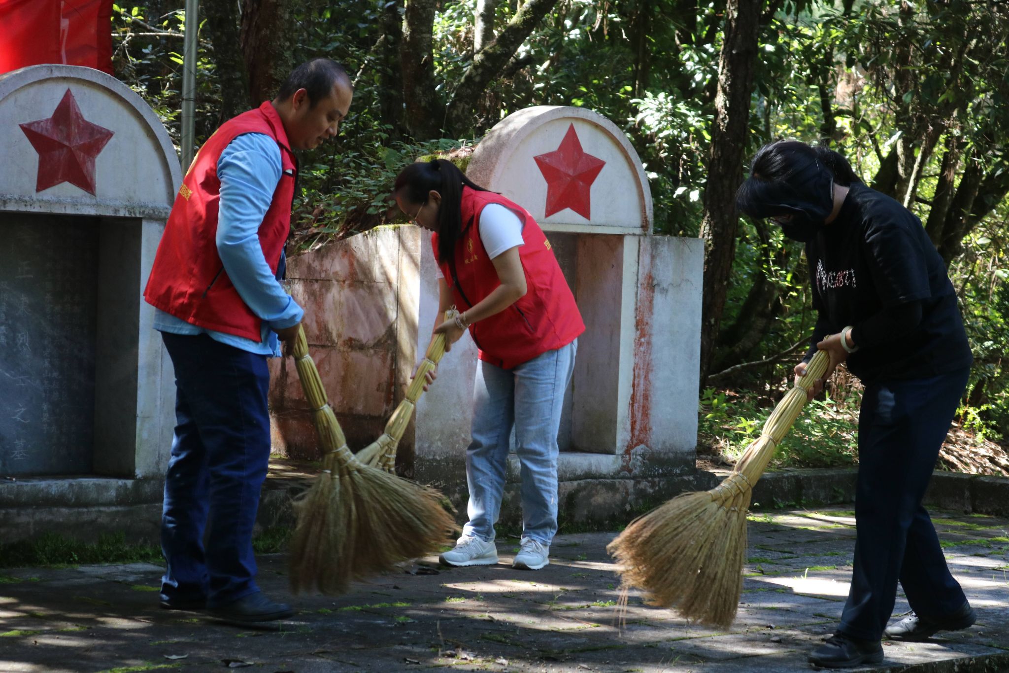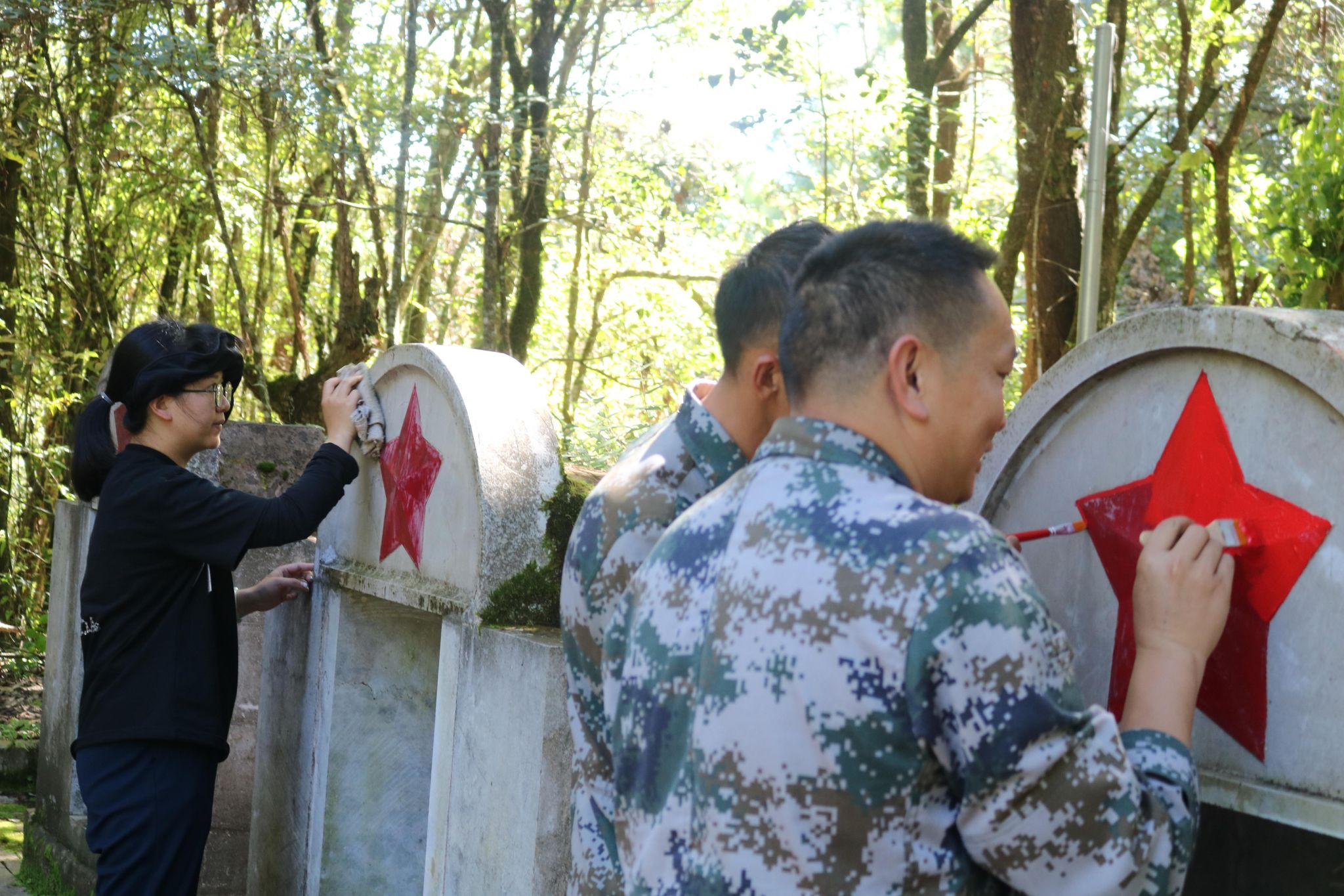 活动现场,志愿者们怀着对烈士的敬意和哀思,分工明确,干劲十足,有的手持扫帚清扫落叶和杂物,有的用毛巾小心翼翼的擦拭着烈士墓碑,有的手持毛笔一丝不苟的在墓碑上描红“五角星”,充分发挥了退役军人不怕脏、不怕累的精神,用实际行动践行了“退伍不褪色”的军人本色。在大家的共同努力下,烈士墓碑愈发整洁、肃穆。