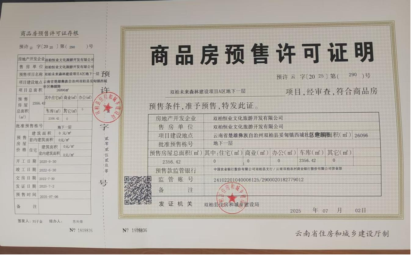 双柏未来森林建设项目A区建设工程地下车位于双柏县城彝源路(南段)东侧,开发建设单位为:双柏恒业文化旅游开发有限公司,企业法定代表人段慧荣,企业统一信用代码为:91532322MA6PE1DTXB,房地产开发资质证书编号为:云建房证开字(2025)618号。该项目土地使用权证书编号为:云(2020)双柏县不动产权第0001238号,建设用地规划许可证编号为:地字第双柏县202000001号,建设工程规划许可证编号为:建字第双柏县202000005号,建筑工程施工许可证编号为:53232222009040001-SX-002。根据双柏县人民政府办公室关于印发《双柏县城市住宅小区地下车位(库)确权登记有关问题的指导意见(试行)的通知》(双政办发〔2025〕4 号)精神,经双柏县住房和城乡建设局现场核实,该车位符合办理商品房预售许可条件,我局已于2025年7月2日在系统中受理接件并打印《商品房预售许可证明》,预售许可证编号为:预许云字〔2025〕第(290)号,此次批准预售范围为未来森林建设项目A区建设工程地下车位(人防以外),预售面积2356.42㎡,可售停车位105个,预售部分资料齐全、手续齐备,具备预售条件。