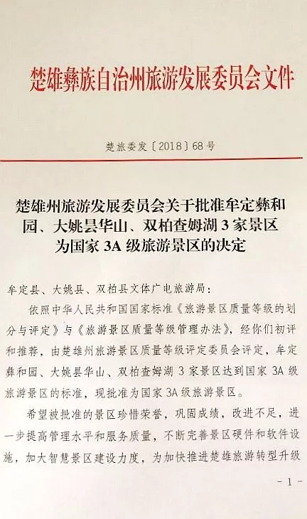 喜报!12月28日楚雄州旅发委公布,依照中华人民共和国国家标准《旅游景区质量等级的划分与评定》和《旅游景区质量等级管理办法》,经州旅发委旅游质量等级评定委员会评定,牟定彝和园、大姚昙华山、双柏查姆湖获评为国家AAA级旅游景区。