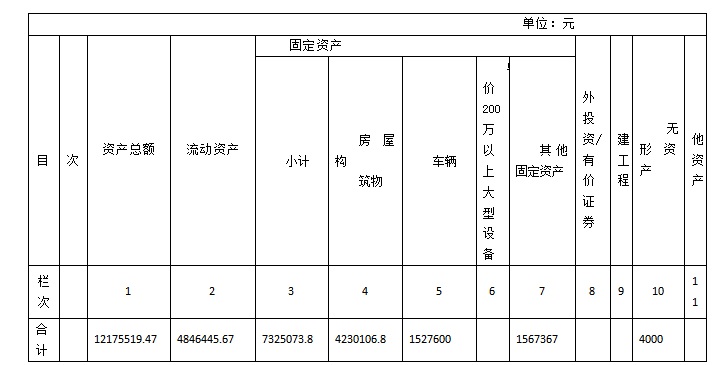 截至2021年12月31日,楚雄州双柏县石咢嘉镇人民政府资产总额 12175519.47元,其中,流动资产4846445.67元,固定资产7325073.80元,无形资产4000.00元。与上年相比,本年资产总额增加277608元,其中:固定资产增加 277607.00元,主要增加原因为双柏县公路管理段划入新树道班(面积98.00平方米,固定资产原值11760.00元),新购入电脑、文件柜、卫星电话等固定资产一批247800元。处置房屋建筑物0平方米,账面原值0元;处置车辆0辆,账面原值0元;报废报损资产0项,账面原值0元,实现资产处置收入0元;出租房屋0平方米,账面原值0元,实现资产使用收入0元。