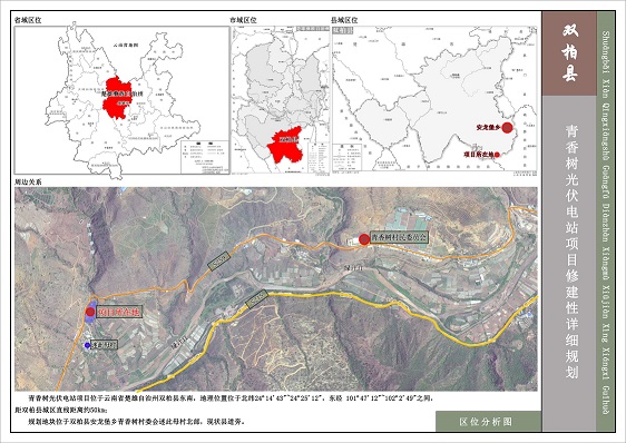 根据《楚雄州实施“阳光规划”的意见》,现对双柏徽阳新能源科技有限公司青香树光伏电站项目修建性详细规划进行审查前公示,社会各界人士若有意见和建议,请在公示期内向公示组织单位电话或者书面反映。