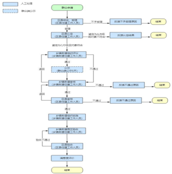 5.县级审批。县住建部门要对乡(镇)上报的材料进行复核,符合政策条件的对象,予以审批。