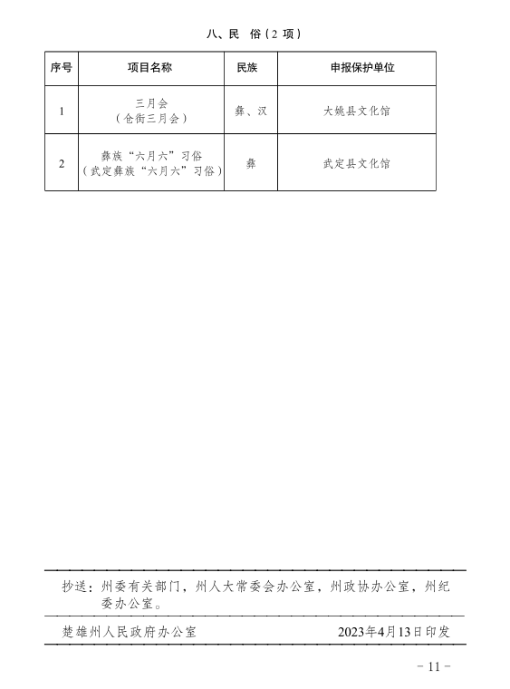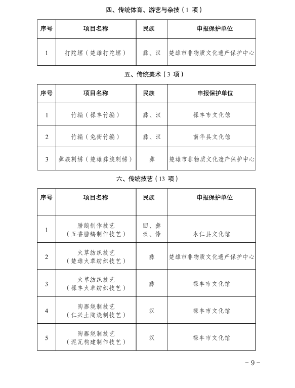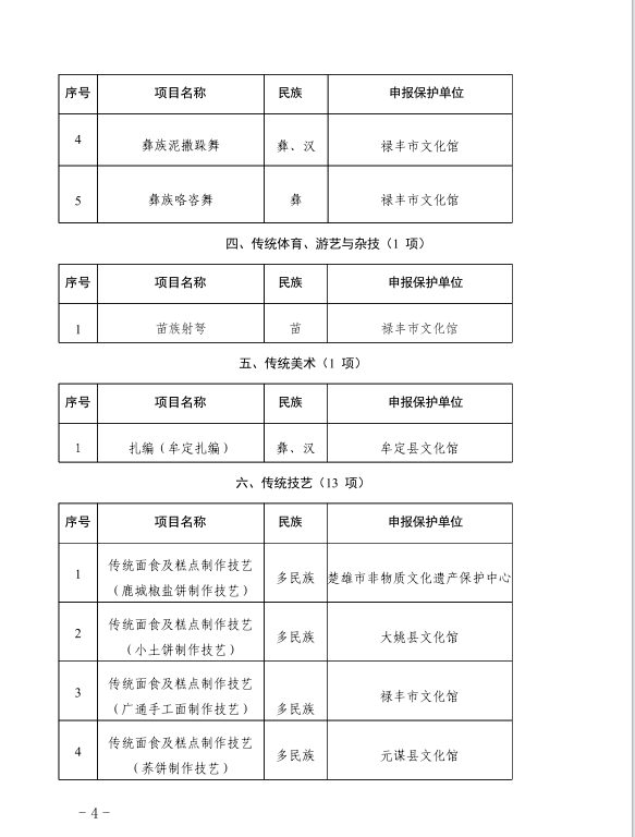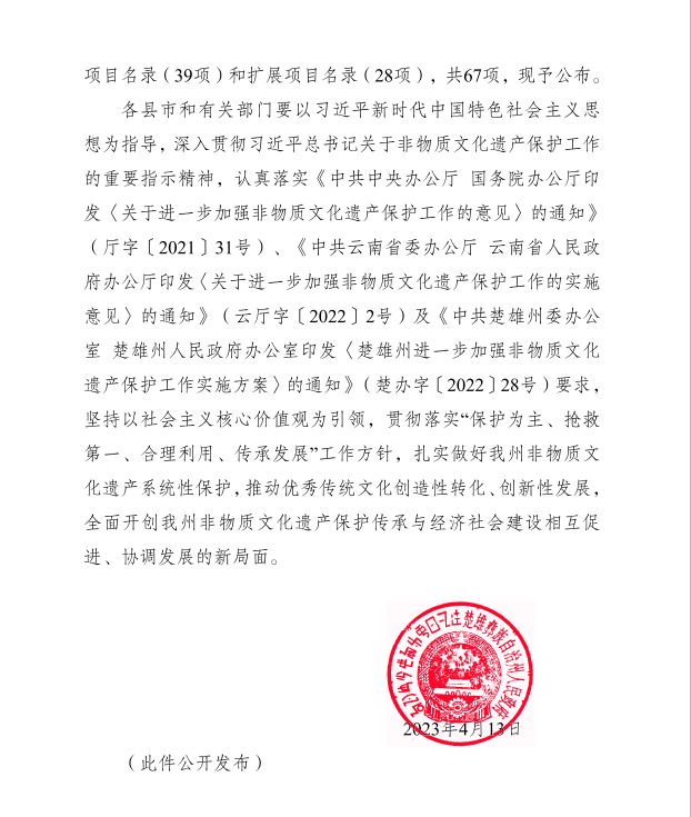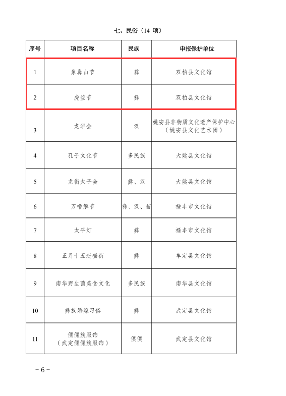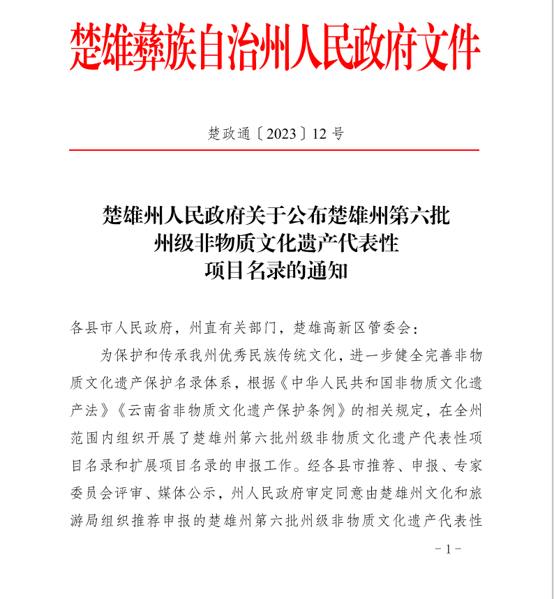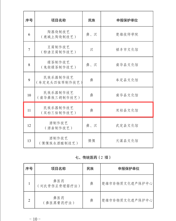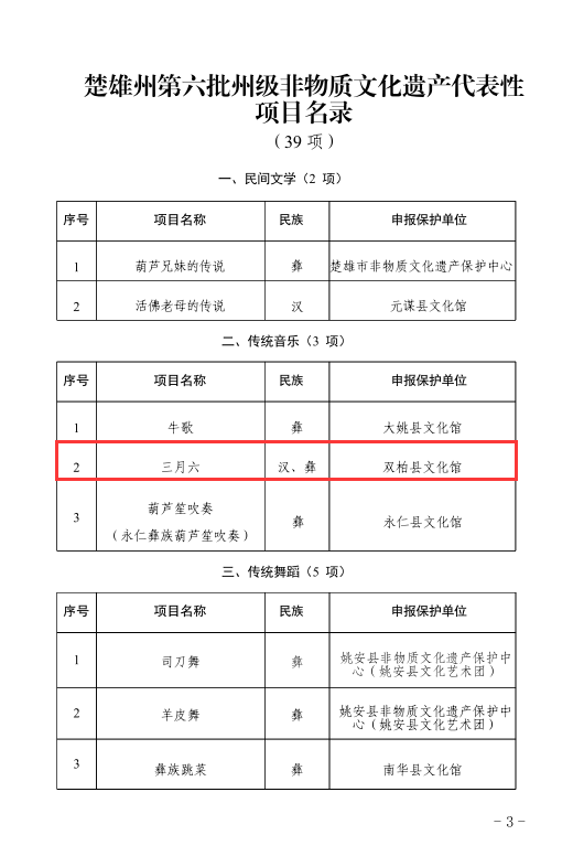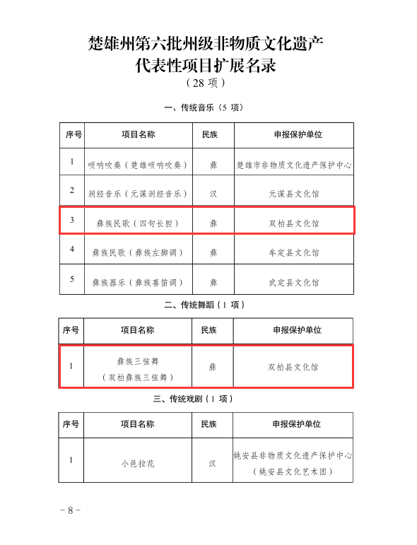 近日,楚雄州人民政府公布第六批州级非物质文化遗产代表性项目名录67项(项目名录39项,项目扩展名录28项),双柏县传统音乐三月六、民俗象鼻山节和虎笙节、传统音乐四句长腔、传统舞蹈双柏彝族三弦舞、传统技艺双柏三弦制作技艺名列其中,双柏县非物质文化遗产保护工作再结硕果。至目前,双柏县共有国家级非遗代表性项目3项,代表性传承人2人;省级非遗代表性项目7项,代表性传承人5人;州级非遗代表性项目24项,代表性传承人19人;县级非遗代表性项目52项,代表性传承人117人。