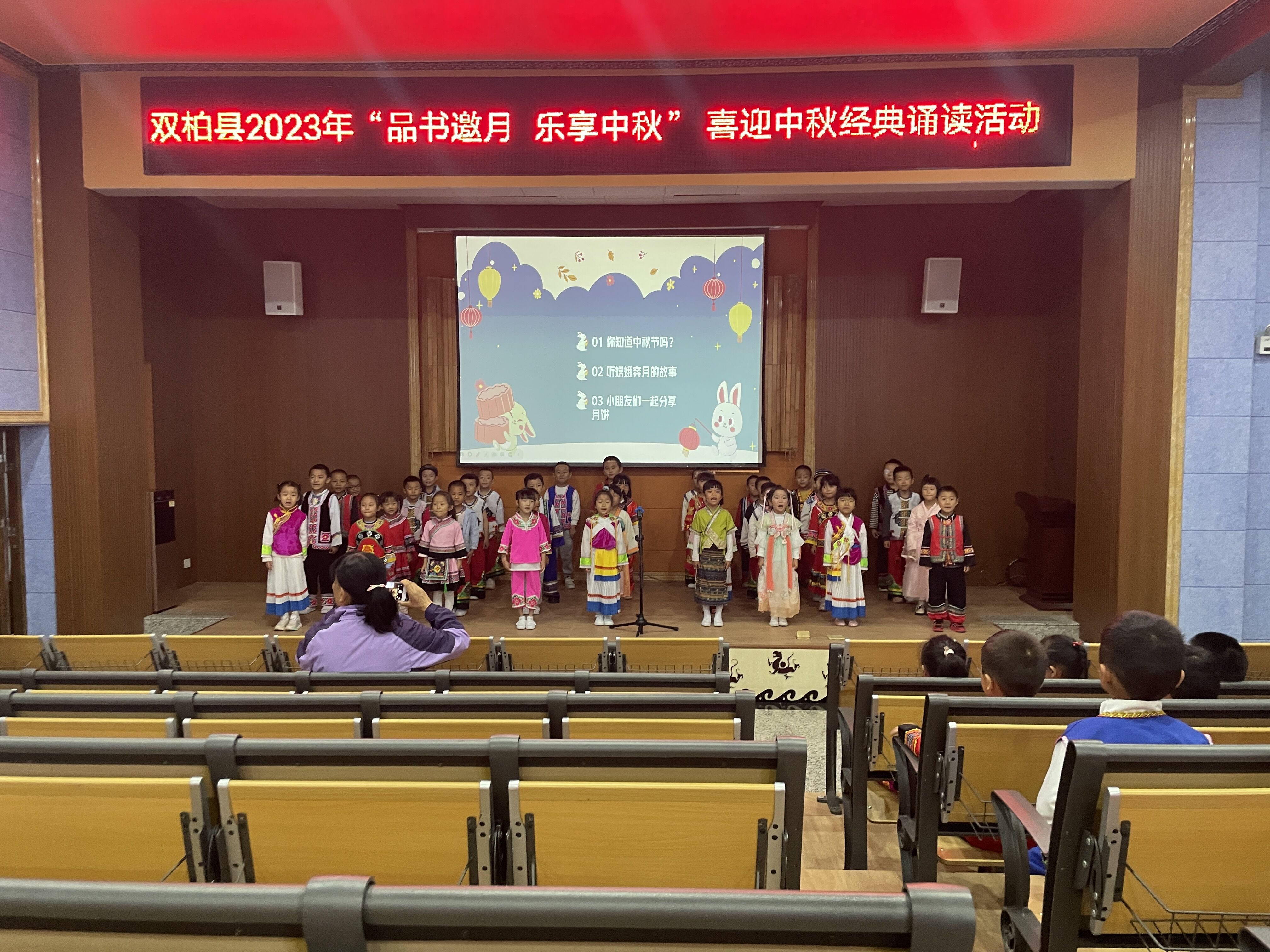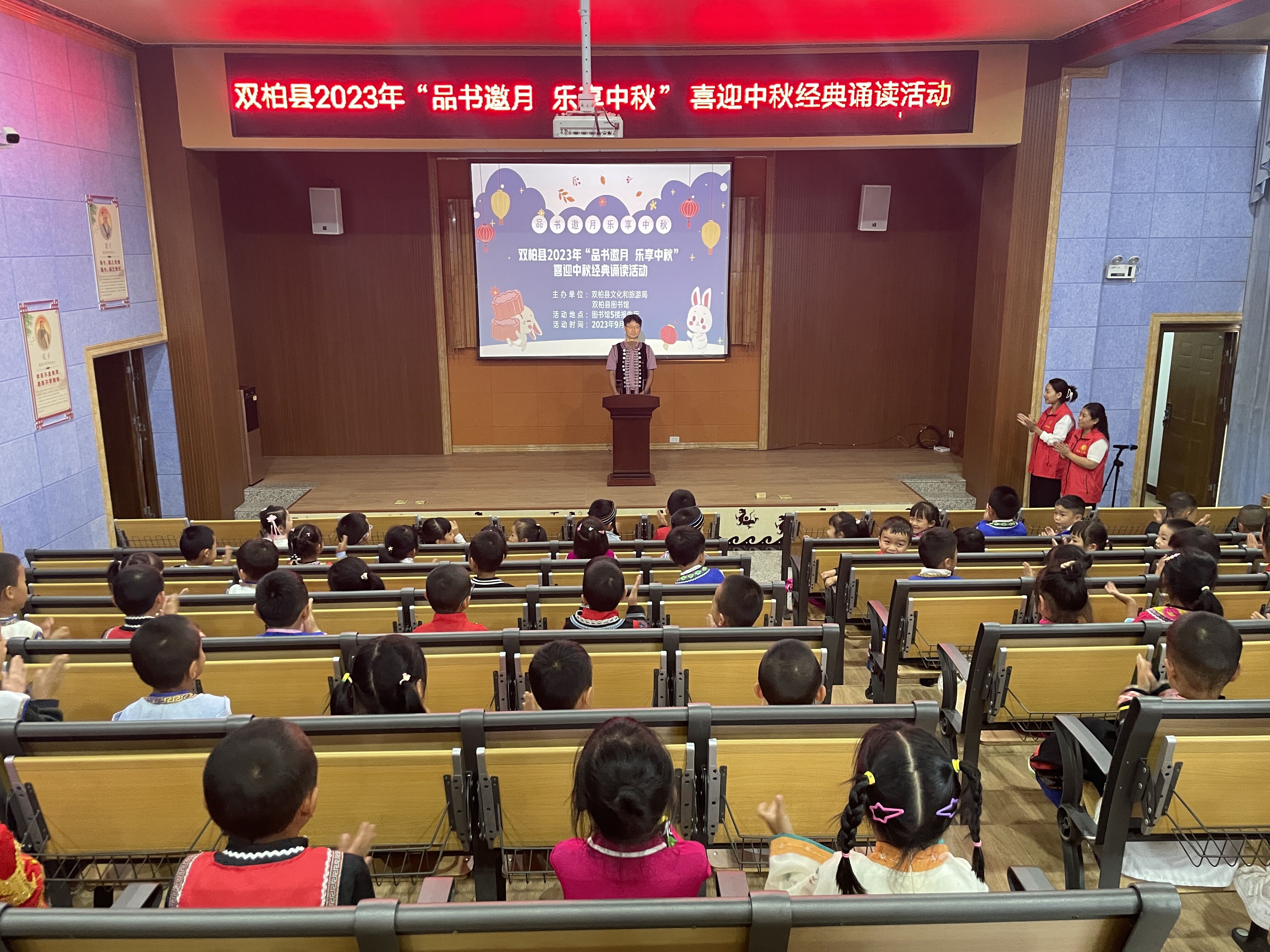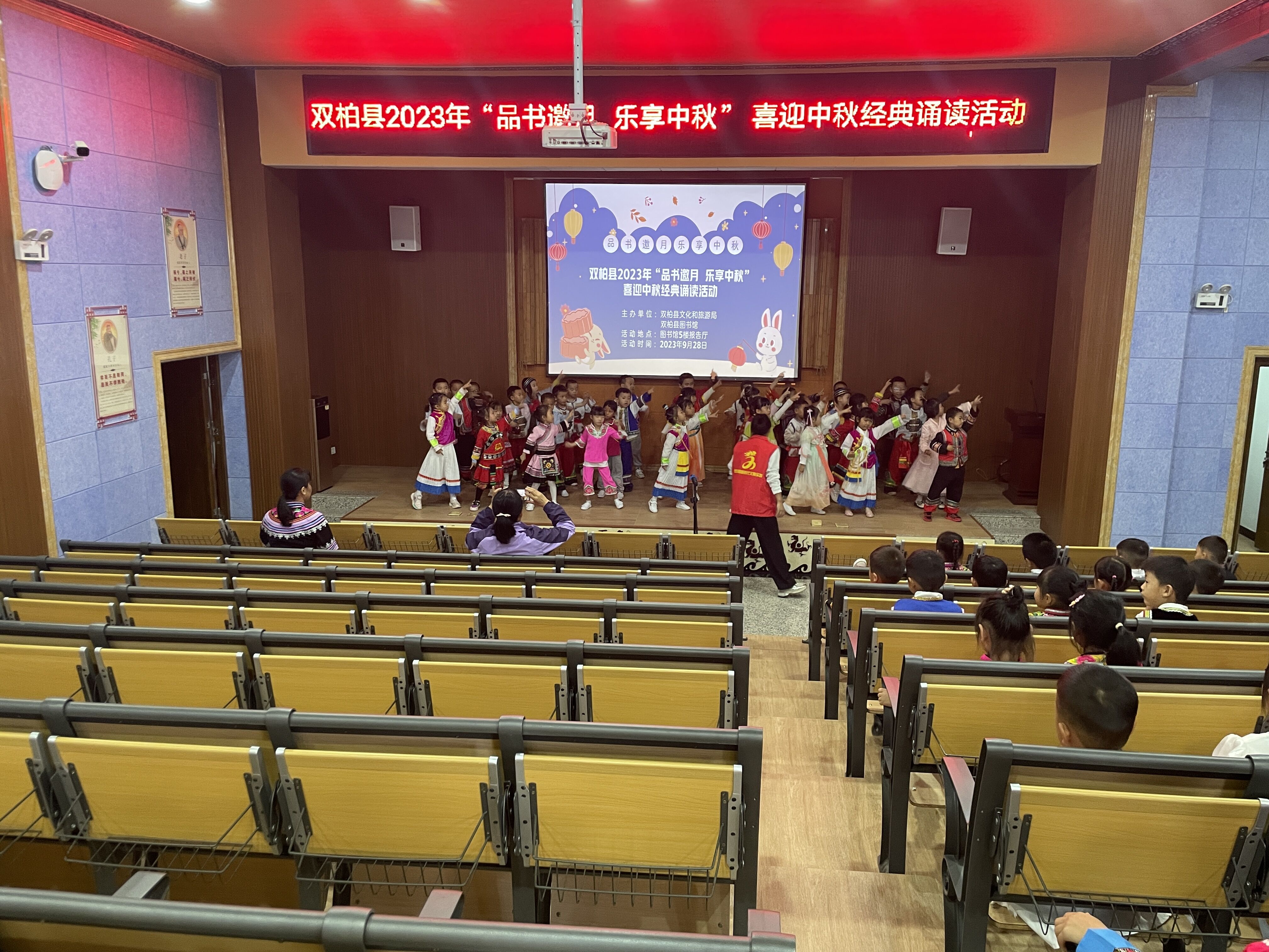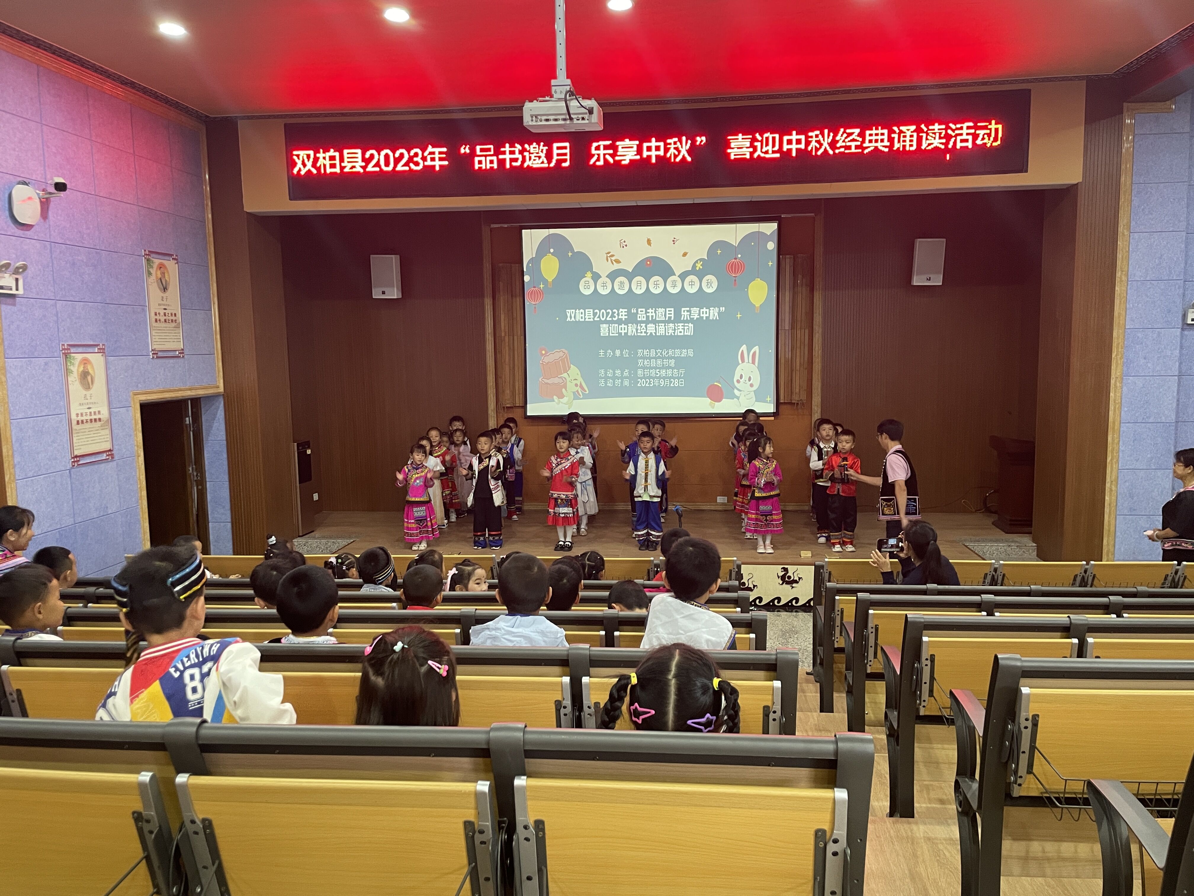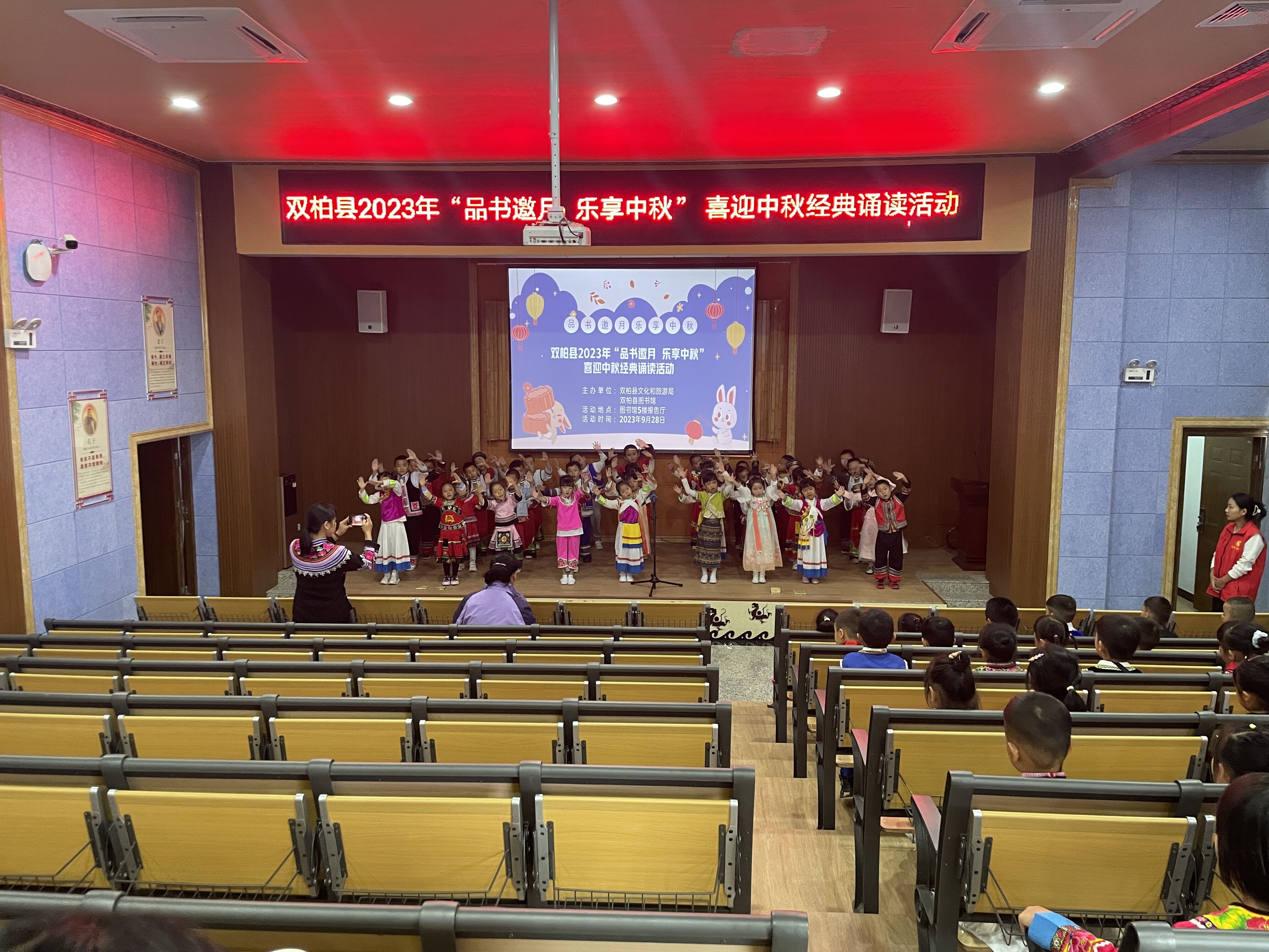 秋风送爽,丹桂飘香,送走了炎炎夏日,我们迎来了硕果累累的秋天,也迎来了具有东方文化色彩的中秋节。文化是民族的根本,而节日是民族文化、民族精神传承的重要载体。时值中秋佳节来临之际,为弘扬中华传统节庆文化,营造浓厚的中秋节日文化氛围,让幼儿感受中华优秀传统文化的魅力的同时,培养爱国情怀,双柏县图书馆联合双柏县机关幼儿园在图书馆5楼报告厅开展“品书邀月、乐享中秋”经典诵读活动。