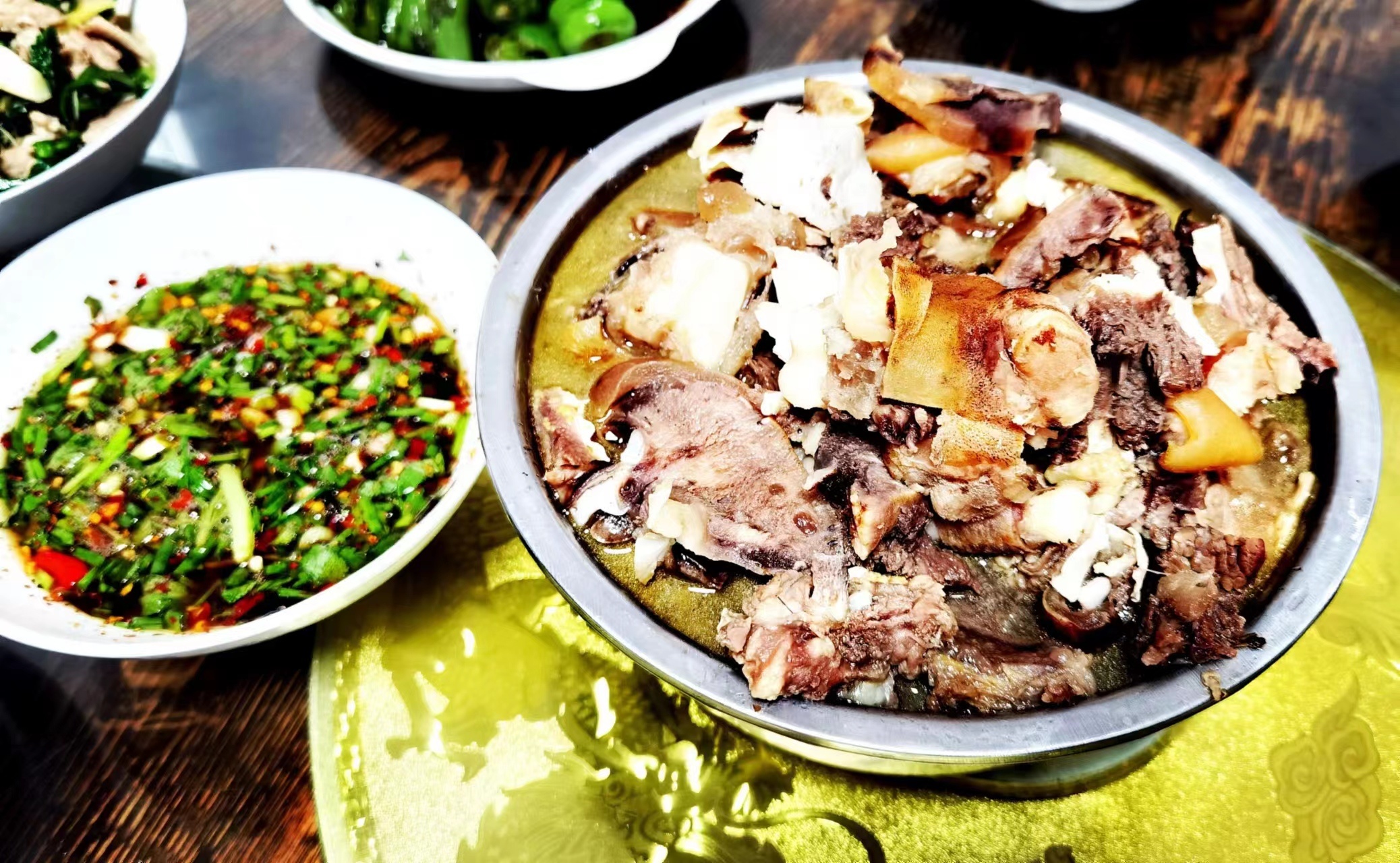 彝家人待客最高礼节就是杀牛,杀羊、猪、鸡次之。双柏草场资源丰富,大庄、法脿、大麦地、安龙堡、爱尼山等乡镇低热河谷地带依托这些资源发展生态畜牧养殖,大力发展本地放山小黄牛和黑山羊。畜牧业发达,各地都有吃牛羊汤锅的习惯。常听人说,热带地方的牛羊肉好吃,而双柏马龙河、河口河、绿汁江沿江一带的牛羊汤锅就成为双柏的美食之最了。本地黄牛吃的是茅针草、笔管草、防风叶、荆芥叶、天门冬茎等草药,喝的山涧水,整日在灌木丛里穿梭觅食,使得小黄牛肉质紧实鲜嫩,瘦肉率较高,肉的味道也与众不同。宰杀后的牛肉颜色鲜红,油脂饱满、纹理清晰,与市场上催肥出栏的牛肉完全不同。一锅清汤就能熬煮出香气喷鼻的牛肉,经过细火慢炖两至三个小时,原汁原味,汤白鲜甜的牛肉呈现,看似清汤寡水,但牛肉柔软甘香,入口清香缠绵、筋道弹牙,配上一碗火烧胡辣子蘸水,真是肉香浓郁,回味无穷,让汤锅越吃越有滋味。牛汤锅不仅是彝家人重要节庆日餐桌上的主菜,也是冬春进补的原生态好物,优质蛋白丰富,对于无肉不欢的吃货一定不能错过。