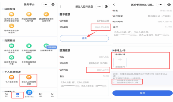 点击【服务】进入页面,找到“个人信息修改”模块,点击“新生儿证件信息变更”功能,输入新生儿的“出生医学证明编号”,点击“查询”,查询出新生儿基本信息后,姓名不可更改,输入新生儿“身份证号码”。材料上传“出生医学证明+身份证”或“出生医学证明+户口簿”,点击【提交】即可。