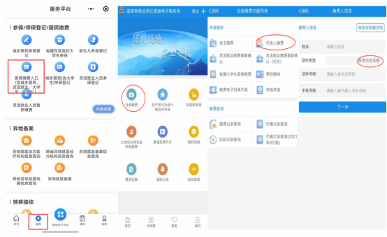打开“云南医保”小程序,点击【服务】进入页面,找到“参保/停保登记/居民缴费”模块,点击“医保缴费入口(含城乡居民、灵活就业、大学生、新生儿)”功能,跳转至税务渠道进行缴费。