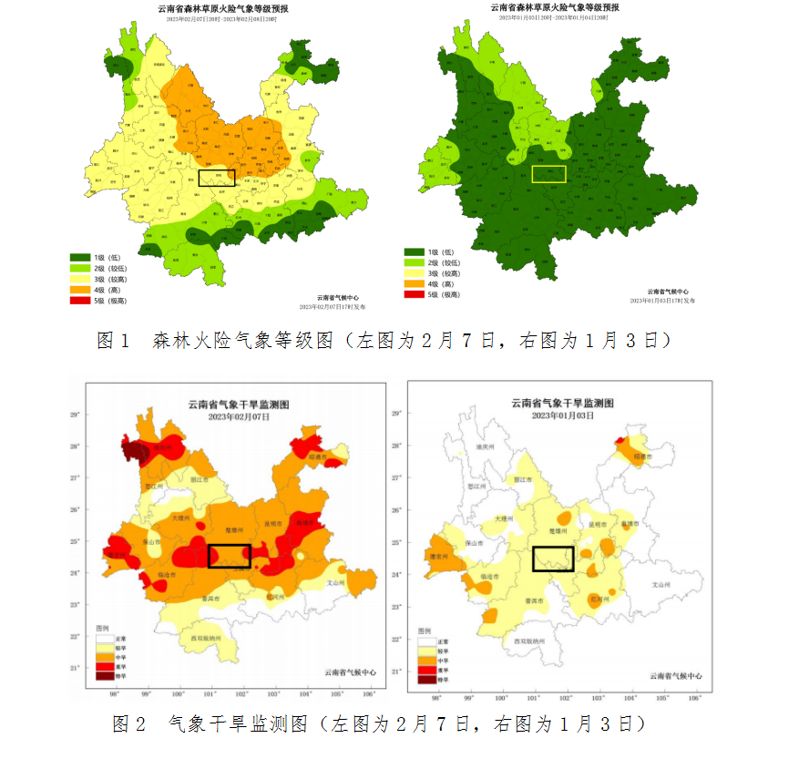 1月以来降水偏少、气温偏高导致我县气象干旱逐渐发展,森林火险气象等级明显升高,根据云南省生态气象和卫星遥感中心监测分析,目前我县森林火险气象等级已经由一月初的1级上升到3-4级,气象干旱已经由1月初的大部轻旱发展为大部中旱局地重旱。