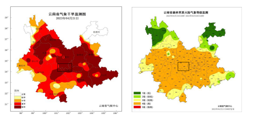 长期连续降水偏少、气温偏高导致我县气象干旱发展迅速。根据云南省卫星遥感中心监测分析,截至4月20日,我县气象干旱已经达到特旱等级,森林火险气象等级为4级。4月13日,我县发布干旱橙色预警。