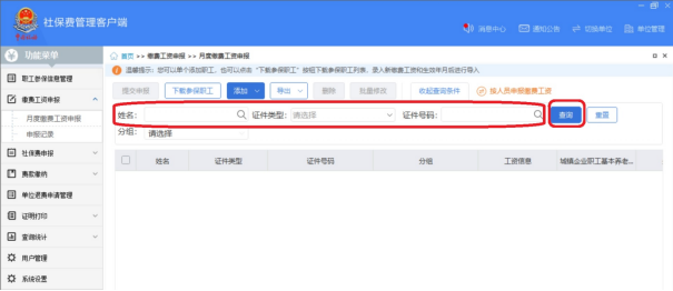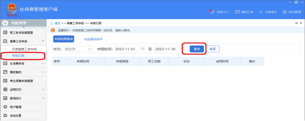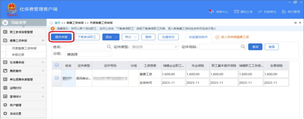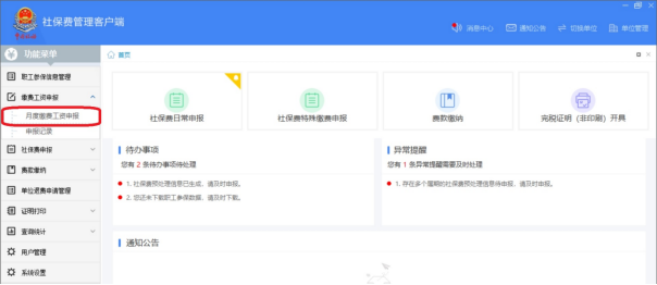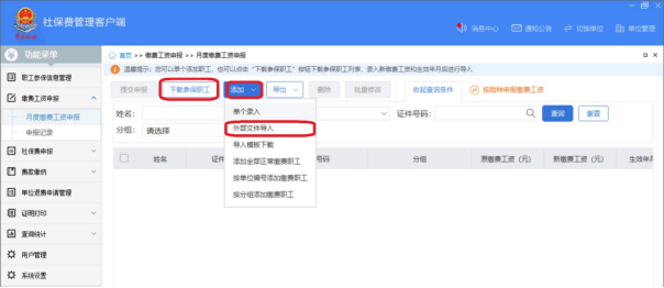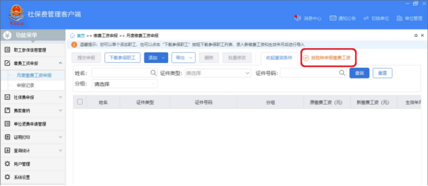 进入“社保费管理客户端”,在“功能菜单”列表选择“缴费工资申报——月度缴费工资申报”模块,进入后点击右上方橙色字样“按险种申报缴费工资”进行切换。(注:右上方橙色字样提示内容与当前界面显示内容相反,当前仅申报基本医疗保险工资基数,请注意选择切换。)