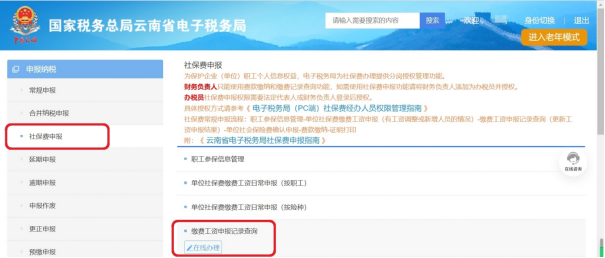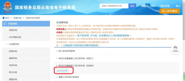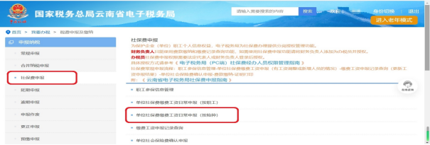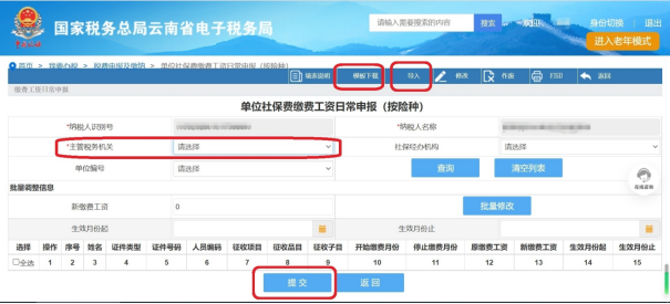 进入“国家税务总局云南省电子税务局”,进入“我要办税——税费申报及缴纳”模块,在左侧功能菜单选择“社保费申报”模块,点击右侧列表“单位社保费缴费工资日常申报(按险种)—在线办理”模块进入,选择主管税务机关,点击“模板下载”按钮下载单位社保费缴费工资预填报(按险种)导入模板,在Excel表格中完善证件类型、证件号码、姓名、人员编码、征收项目、征收品目、新缴费工资、生效年月起(2024-01)等信息,保存表格后点击“导入”按钮进行导入,完成后点击“提交”按钮。(注:为确保数据准确性,完成缴费工资申报后请到“缴费工资申报记录模块”查看申报明细。)