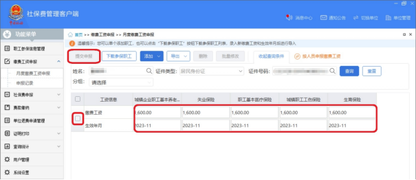 在“月度缴费工资申报”模块,可选择单个职工缴费工资申报或批量职工缴费工资申报。单个职工工资申报:输入名字或身份证号点击“查询”,修改职工基本医疗保险缴费工资及生效年月(2024-01),勾选数据,点击“提交申报”即可。
