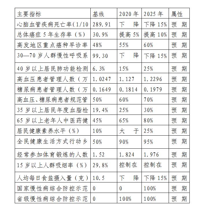 到2020年,全县慢性病防控环境显著改善,努力降低因慢性病导致的过早死亡率,力争30—70岁人群因心脑血管疾病、癌症、慢性呼吸系统疾病和糖尿病导致的过早死亡率较2015年降低10%。到2025年,全县慢性病危险因素得到有效控制,努力实现辖区内人群全生命周期健康管理,力争30—70岁人群因心脑血管疾病、癌症、慢性呼吸系统疾病和糖尿病导致的死亡率较2015年降低20%。逐步提高居民健康期望寿命,有效控制慢性疾病负担。