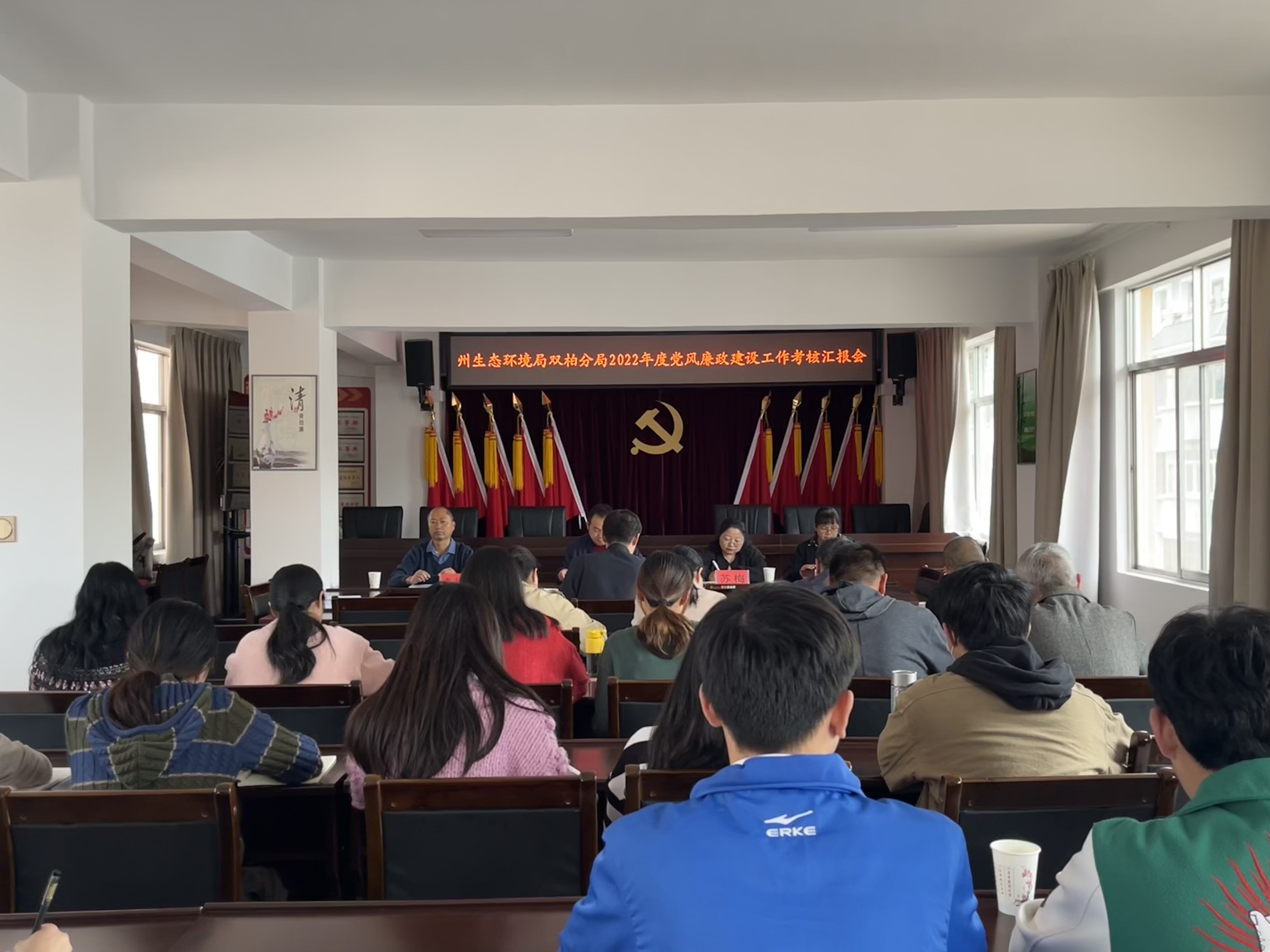会议听取了州生态环境局双柏分局2022年度党风廉政建设责任制落实情况汇报,州生态环境局双柏分局党组成员、副局长李铭同志代表局党政班子进行了现场述责述廉,其他班子成员进行了书面述责述廉。并开展了党政班子及党政班子成员2022年度落实党风廉政建设责任制情况的民主测评。
