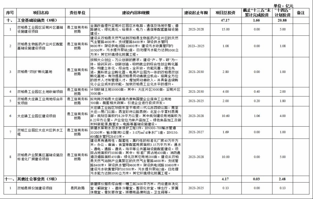 十、工业基础设施类项目8项,项目总投资47.17亿元,其中,接续“十三五”规划重大项目3个,“十三五”末累计完成投资1.66亿元,“十四五”期间计划投资20.88亿元。