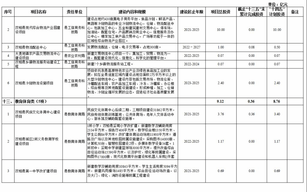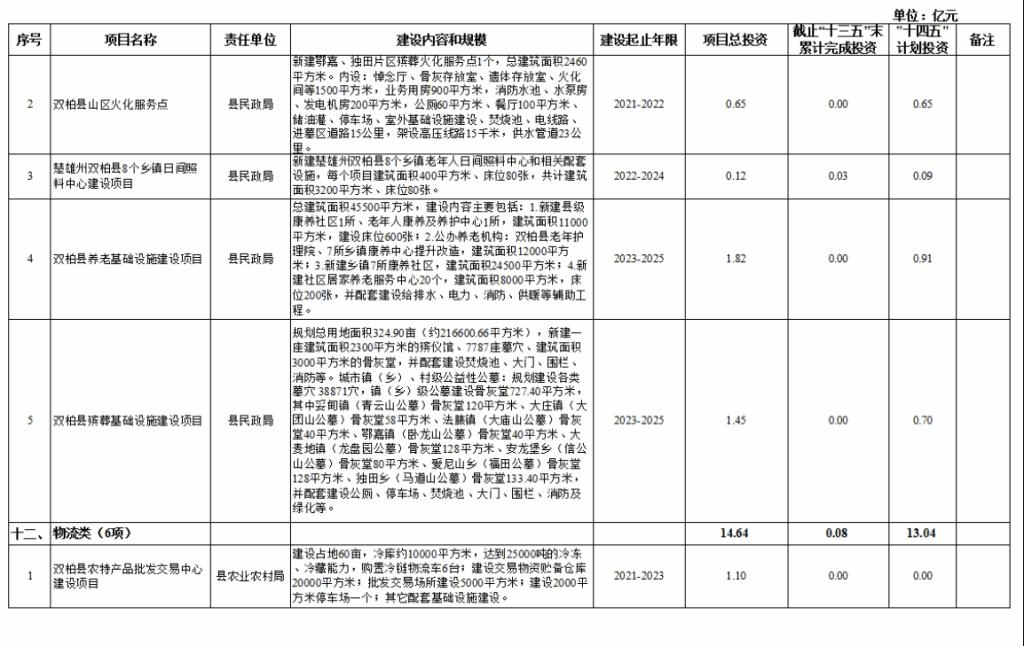 十二、物流类项目6项,项目总投资14.64亿元,其中,接续“十三五”规划重大项目1个,“十三五”末累计完成投资0.08亿元,“十四五”期间计划投资13.04亿元。