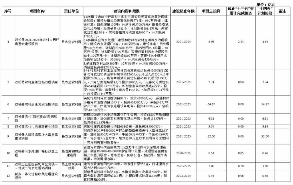 七、生态环境类项目32项,项目总投资301.35亿元,其中,接续“十三五”规划重大项目6个,“十三五”末累计完成投资3.06亿元,“十四五”期间计划投资196.94亿元。