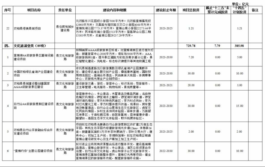 四、文化旅游业类项目89项,项目总投资729.78亿元,其中,接续“十三五”规划重大项目8个,“十三五”末累计完成投资7.79亿元,“十四五”期间计划投资385.98亿元。