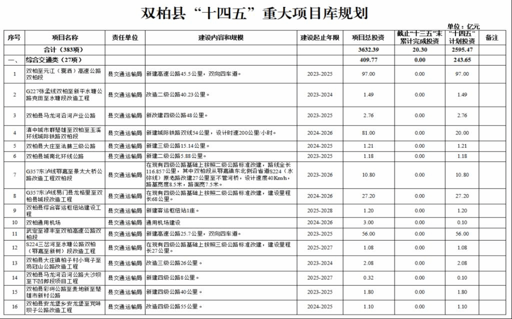 双柏县“十四五”重大项目383项,项目总投资3632.39亿元,其中,接续“十三五”规划重大项目34个,投资117.5亿元,“十三五”末累计完成投资20.3亿元;“十四五”期间计划投资2595.47亿元。按项目类别分为18个领域,其中: