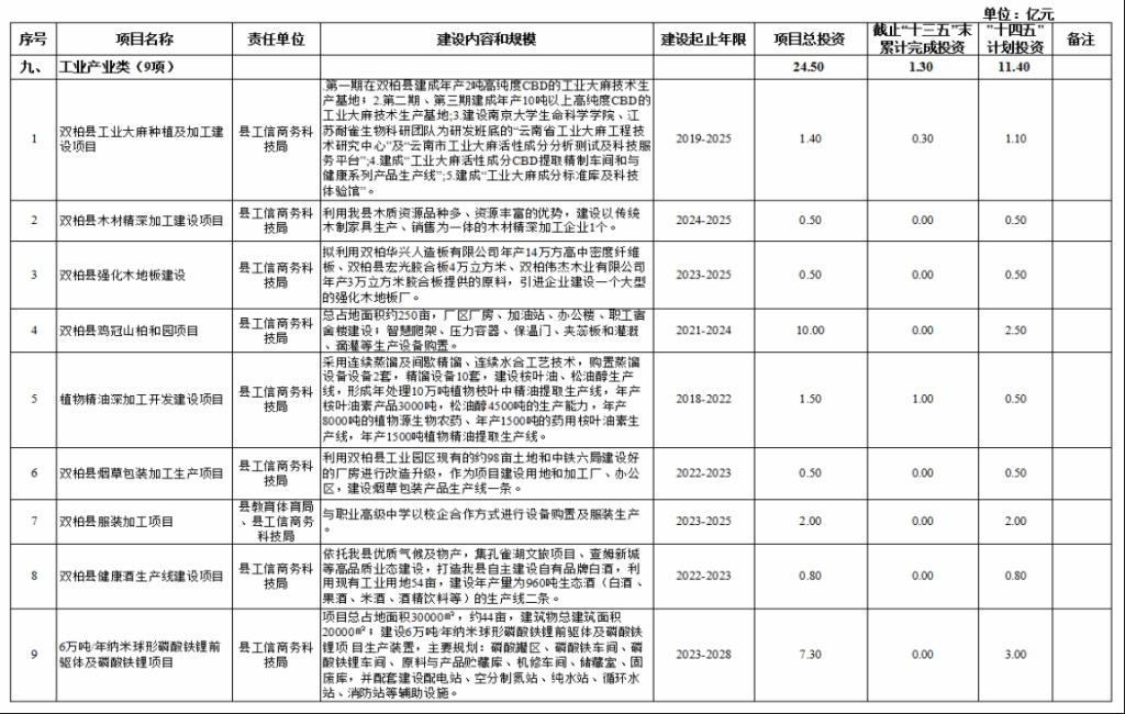 九、工业产业类项目9项,项目总投资24.5亿元,其中,接续“十三五”规划重大项目2个,“十三五”末累计完成投资1.3亿元,“十四五”期间计划投资11.4亿元。