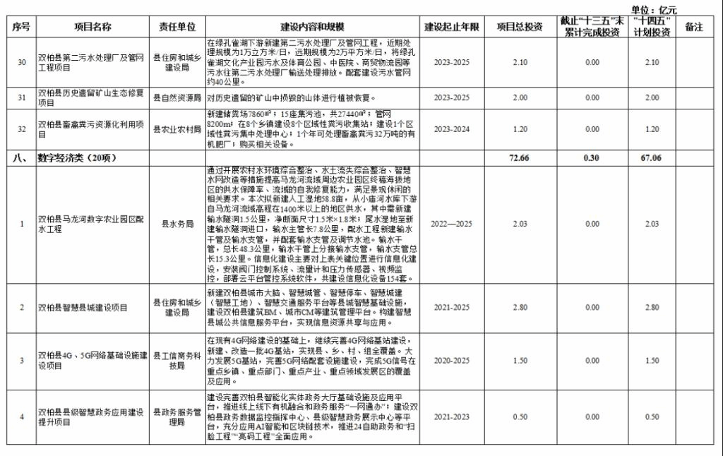 八、数字经济类项目20项,项目总投资72.66亿元,其中,接续“十三五”规划重大项目1个,“十三五”末累计完成投资0.3亿元,“十四五”期间计划投资67.06亿元。