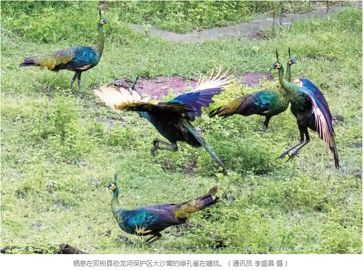 通过多年持续努力,双柏县形成了独具特色的以绿孔雀保护为代表的生物多样性保护成效和经验,生物多样性保护成效更加彰显,境内高等植物多达5486种,兽类110种、禽类310种、两栖爬行动物100种。绿孔雀种群数量达360余只,成为全世界现今种群数量最集中、保护最完好、亚洲最大的绿孔雀栖息地。双柏县先后荣获“国家生态文明建设示范区” “中国天然氧吧” “国家水土保持示范县” “国家卫生县城”等称号,被命名为“省级生态文明建设示范区” “省级园林县城” “省级森林县城”,生态双柏日益成为人们向往的养生福地。(通讯员 李 鑫 尹辅龙)