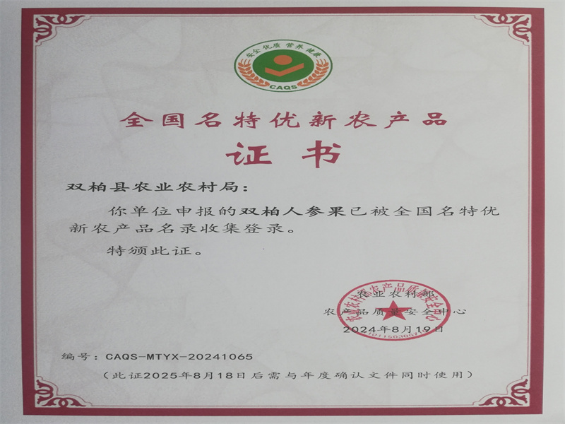 根据农业农村部农产品质量安全中心第32号公告,双柏县农业农村局申请的“双柏人参果”产品,经过州级、省级农业农村部门农产品质量安全与优质化工作机构审核、农业农村部农安中心组织专家技术评审确认,“双柏人参果”具有果大肉厚、水嫩多汁、口感清脆、味道香甜的产品特征,特别是可溶性固形物、氨基酸总量、钾等多项营养品质独特性指标检测显著优于其他产地人参果产品,被成功纳入2024年第二批全国名特优新农产品名录,并核发《全国名特优新农产品证书》,成为双柏县首个全国名特优新农产品。