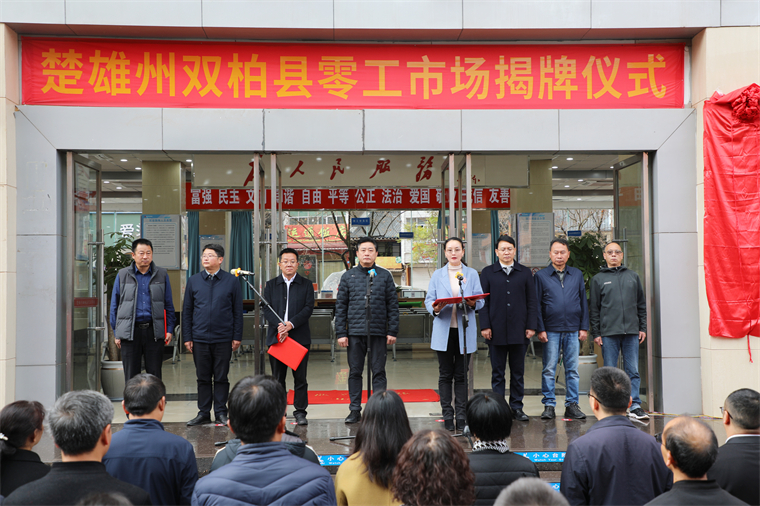 2023年12月14日上午,楚雄州双柏县零工市场启用揭牌仪式在双柏县妥甸镇街心花园举行。县委书记金鸿出席揭牌仪式并宣布“楚雄州双柏县零工市场启用”,县委副书记、县人民政府县长杨梦婷致辞,县人民政府副县长普学昌介绍零工市场建设情况。县委副书记、县就业工作领导小组组长王光林主持揭牌仪式。县委常委、县委组织部部长朱德清,县委常委、县委办主任尹国进,县人大常委会副主任杨光盛,县政协副主席尹世久出席了揭牌仪式。县就业工作领导小组成员单位负责人、县内重点企业、零工代表等相关人员参加揭牌仪式。