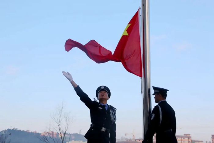 上午9时,随着指挥员的一声令下,升旗仪式正式开始,护旗队员迈着坚定有力的步伐,护送国旗至升旗台,在庄严的国歌声中,鲜艳的五星红旗冉冉升起,全体民警、辅警庄严列队,向国旗敬礼,表达着对伟大祖国的绝对忠诚和无限热爱。