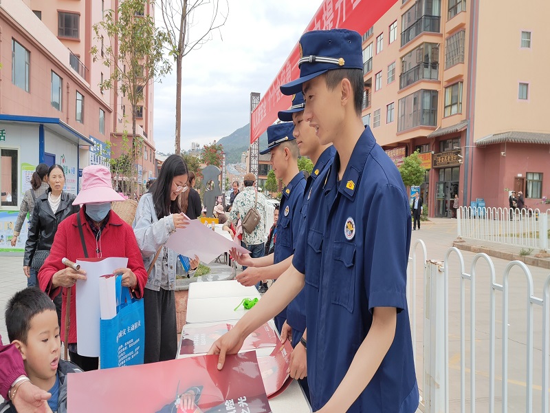 活动现场,双柏县消防救援大队宣传人员提前设置消防宣传咨询台,通过向群众发放《消防安全知识手册》、《消防安全常识二十条》、《社区居民火灾防控手册》、《消防安全提示海报》等消防宣传资料、为群众讲解消防常识和火灾逃生常识及灭火器使用方法,提示群众发生火灾要第一时间拨打119报警电话,电动车要在指定位置充电,楼梯和疏散通道不能堆放杂物,家中离人要断火断电等,用群众身边的常见事提醒大家学习消防、重视消防。同时,深入周边经营户,现场讲述如何使用灭火器、火灾现场如何逃生、如何扑救初起火灾等常识,粘贴安全提示海报,并叮嘱商户要教育好小孩不要玩火,把火柴、打火机等危险物放在小孩够不着的地方;不要随意乱扔烟蒂;不要在严禁烟火的地方吸烟、家中阳台、楼道内的杂物要及时进行清理,确保生命通道畅通;电气线路、液化气灶等用火用电用气情况要定期进行自检自查,防范火灾事故的发生。